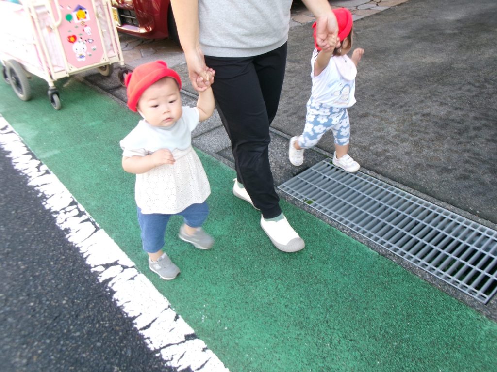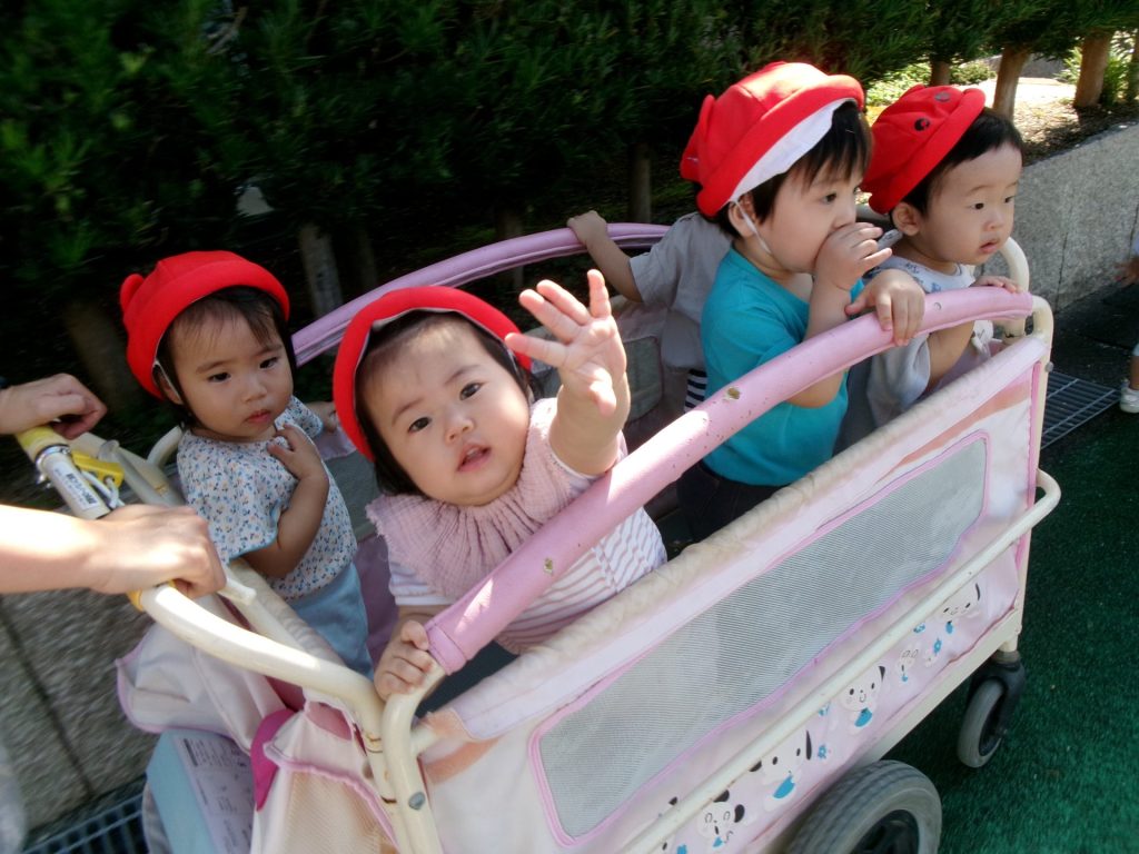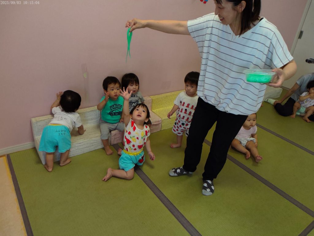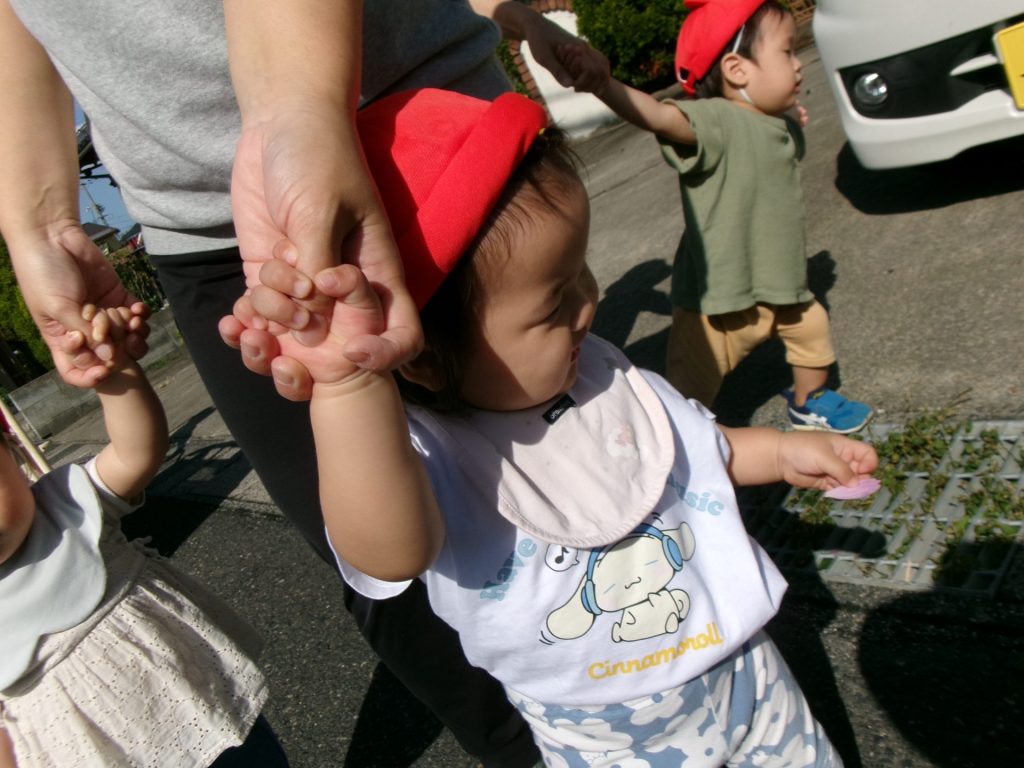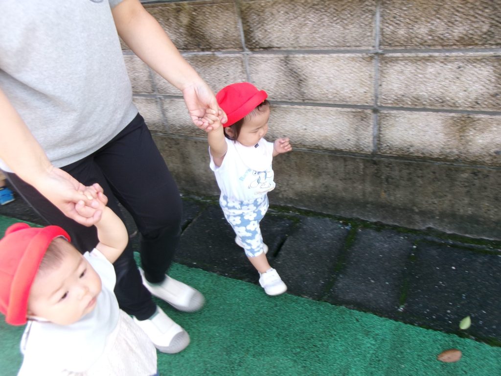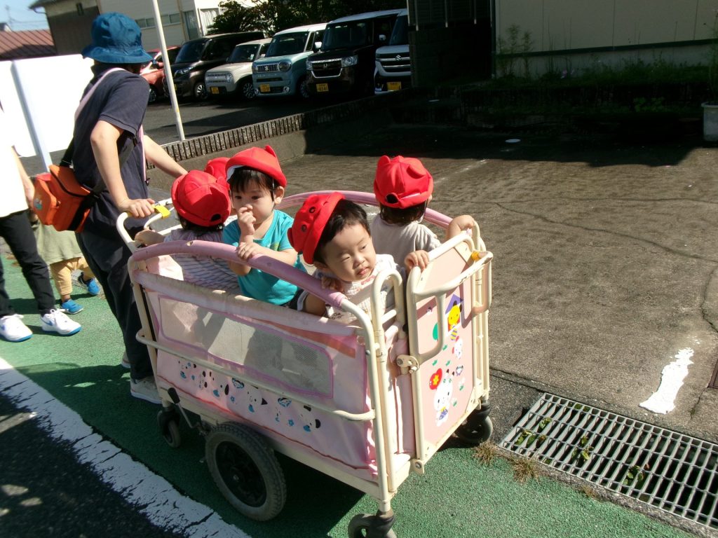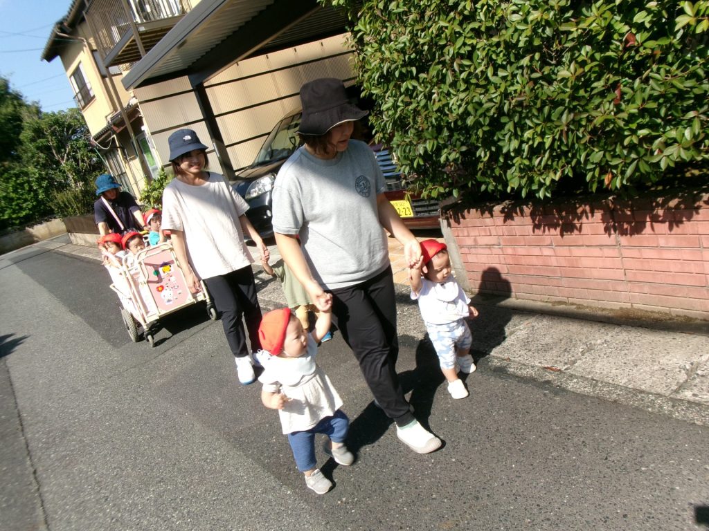 涼しい室内のびのびと好きな遊びを見つけて遊んだり、お外に出た時は涼しい日陰でお散歩をして遊んでいます。