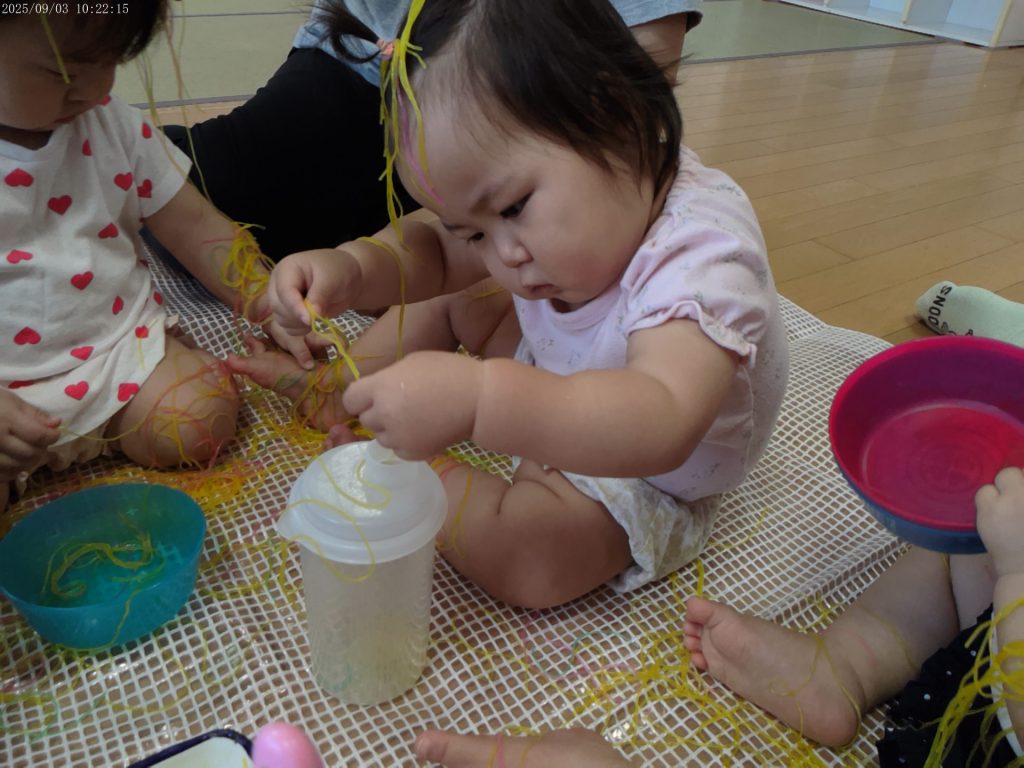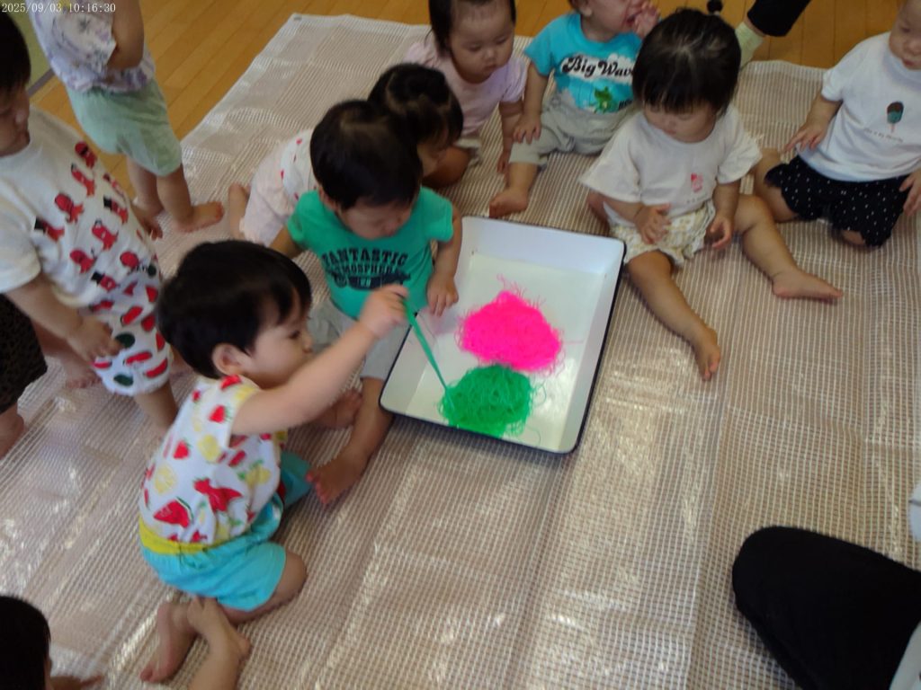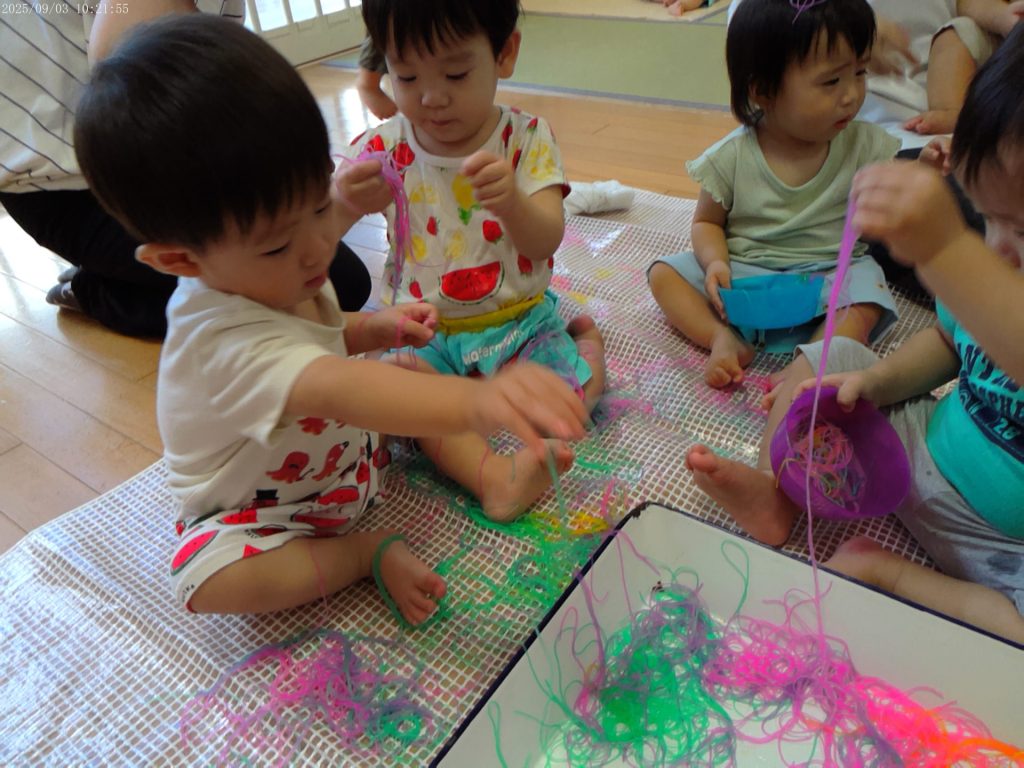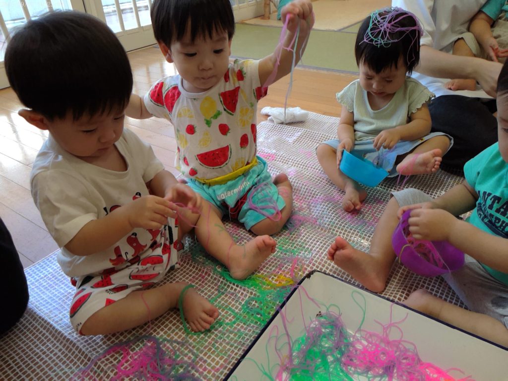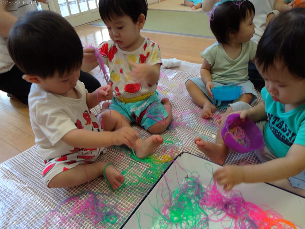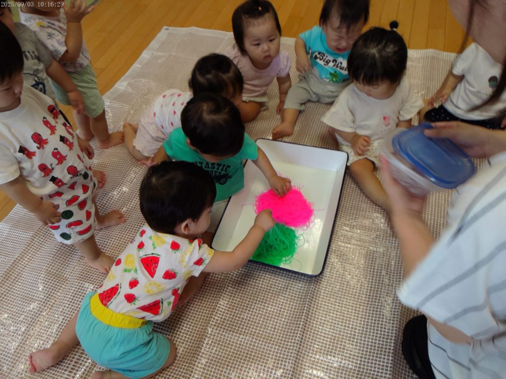 今まで身近にあるいろいろなものの感触を味わいながら遊ぶことを経験してきましたが、今回は自ら興味をもって、触って遊んでいる姿がたくさん見られました。