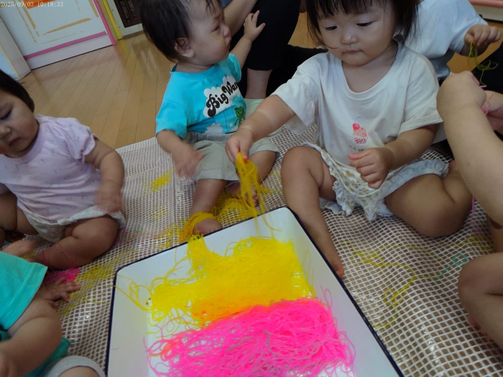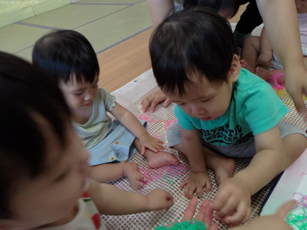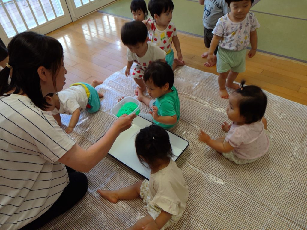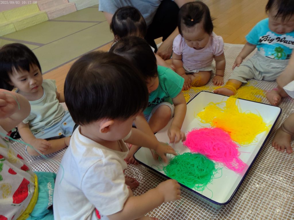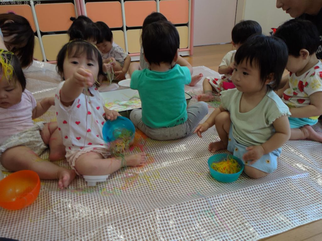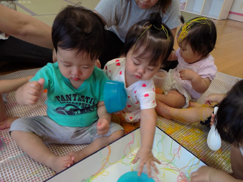 今まで身近にあるいろいろなものの感触を味わいながら遊ぶことを経験してきましたが、今回は自ら興味をもって、触って遊んでいる姿がたくさん見られました。