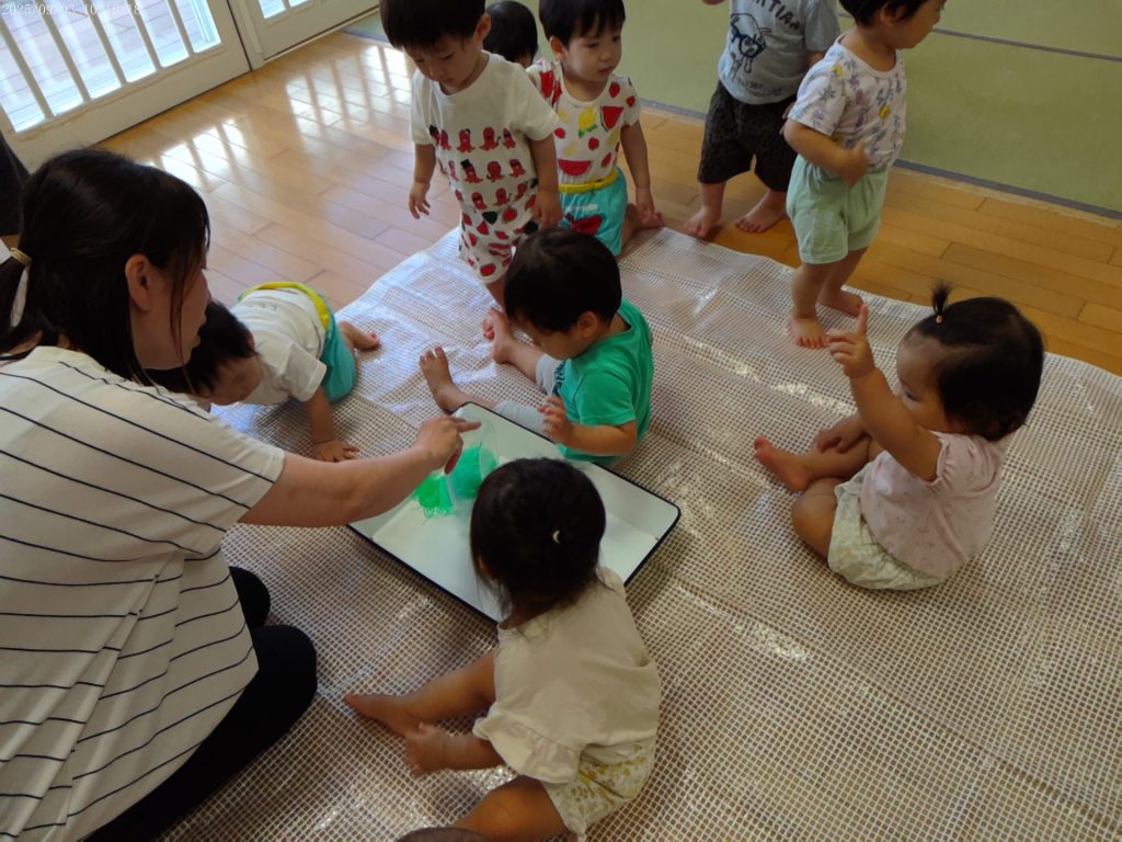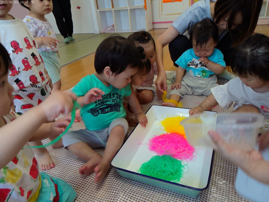 冷たい氷とにゅるっとしたこんにゃくの感触を楽しみました。身近なものへの興味・関心がどんどん膨らむ夏にしたいと思います♪