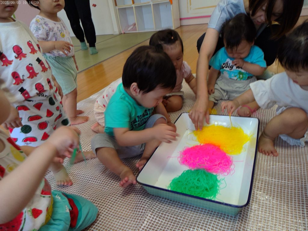 寒天遊びをしました。プニプニした水風船の中からにゅるっと出てきた寒天にドキドキ・ワクワクしました。