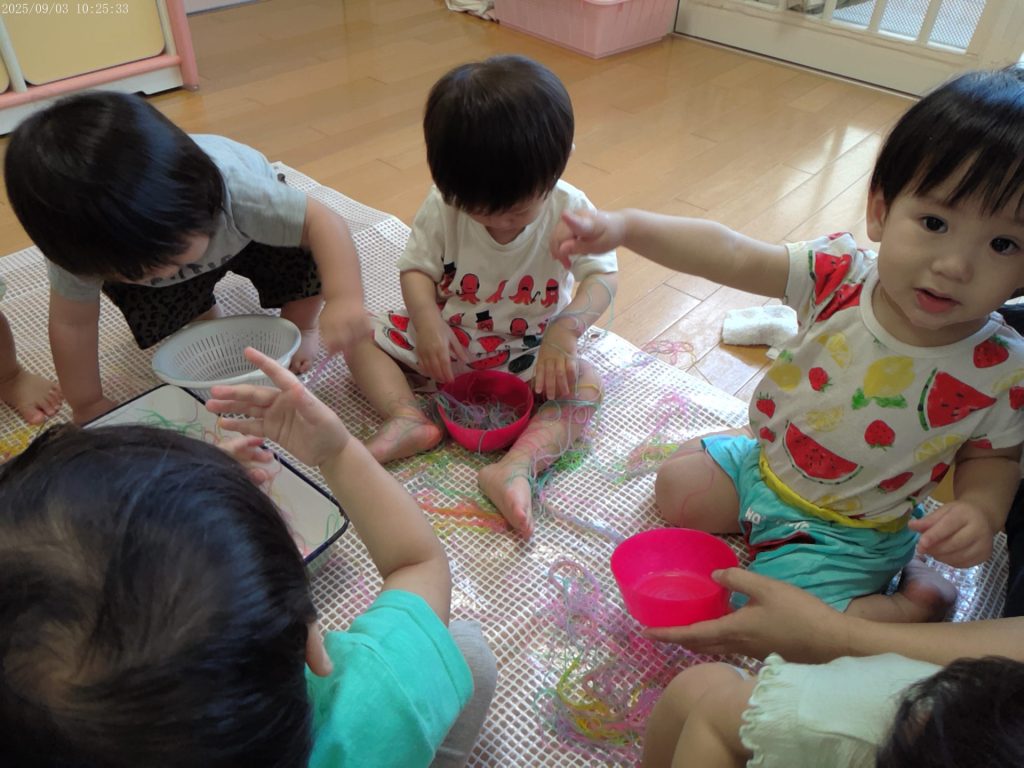 冷たい氷やお水にちょんちょん…水風船やスライム風船、掴みやすい玩具、ジャーっとでるシャワーの水に興味津々のひよこちゃんたちです。