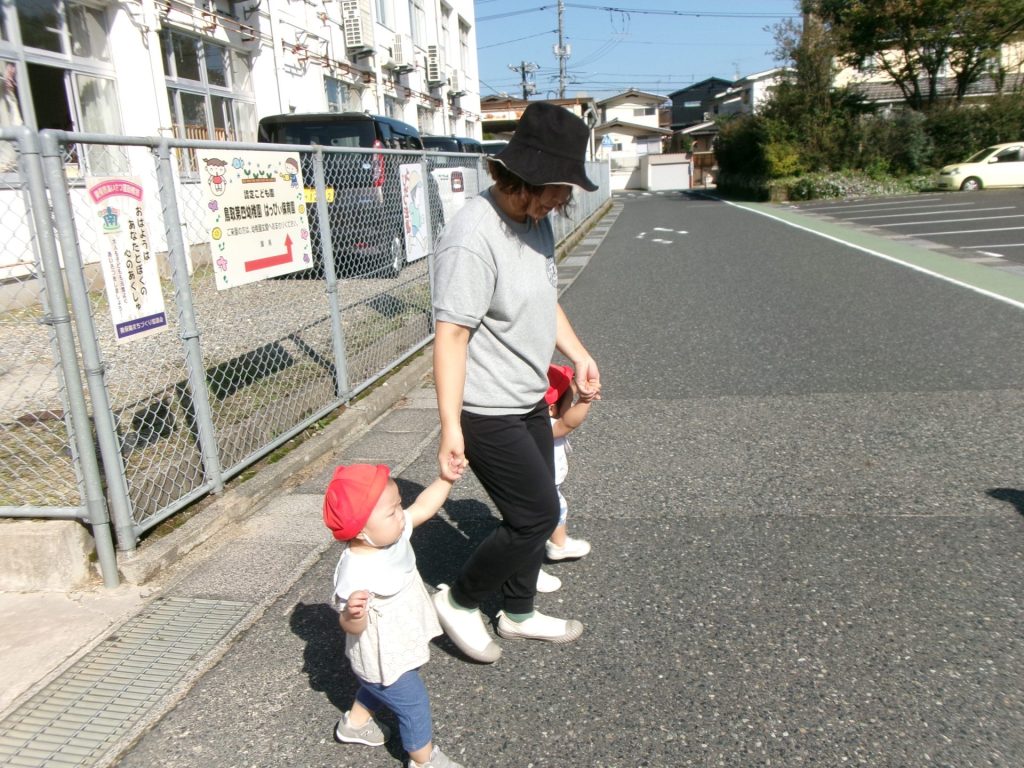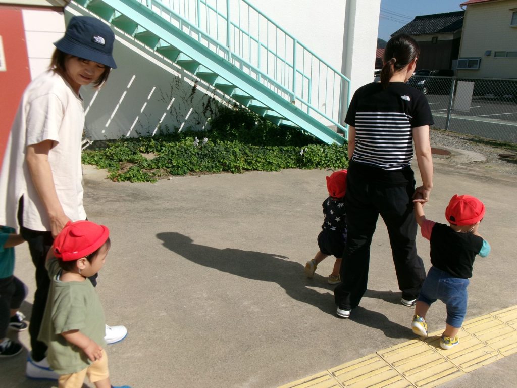 クロネコヤマトさんによる交通安全指導を見に行きました。安全指導の間、じっと耳を傾けて座って見ていました。横断歩道を渡る異年齢の友達の姿もしっかり見て学んでいたひよこ組さんです。