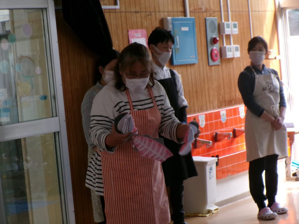 たくさん遊んだ後、お花紙をコロコロローラーで集めて集めて…魚になりました。