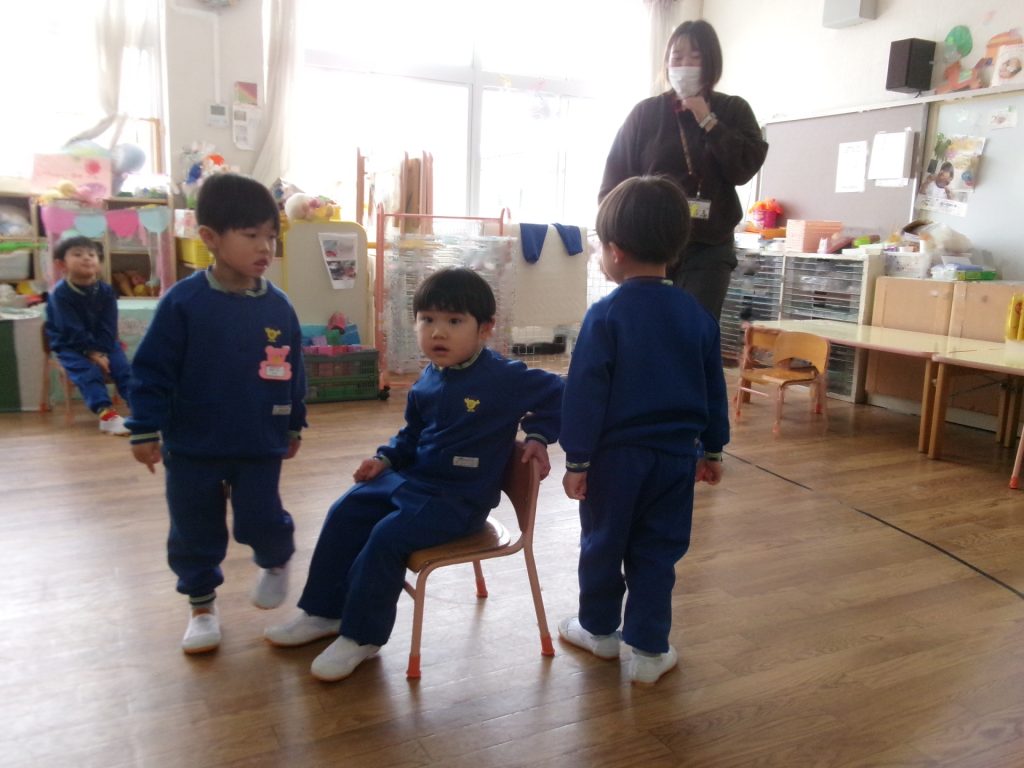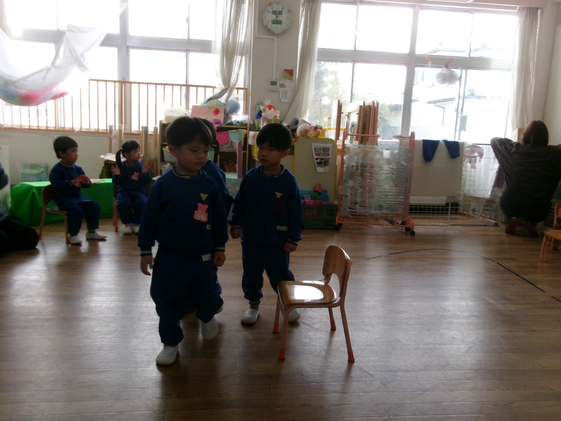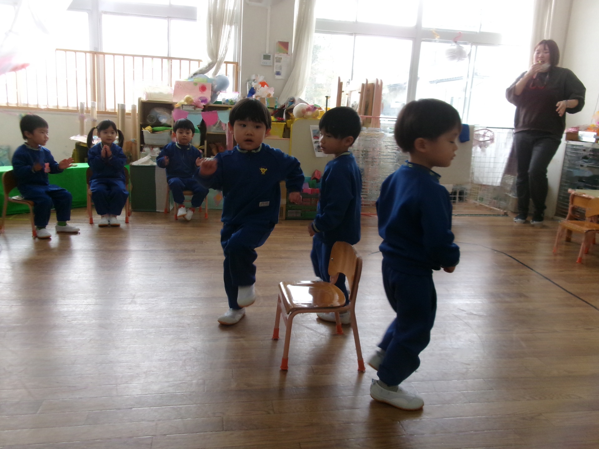 音楽がいつ止まるかな?と少しドキドキしながら周りを歩く子ども達です。曲が止まったと同時に空いている椅子を見つけて…!