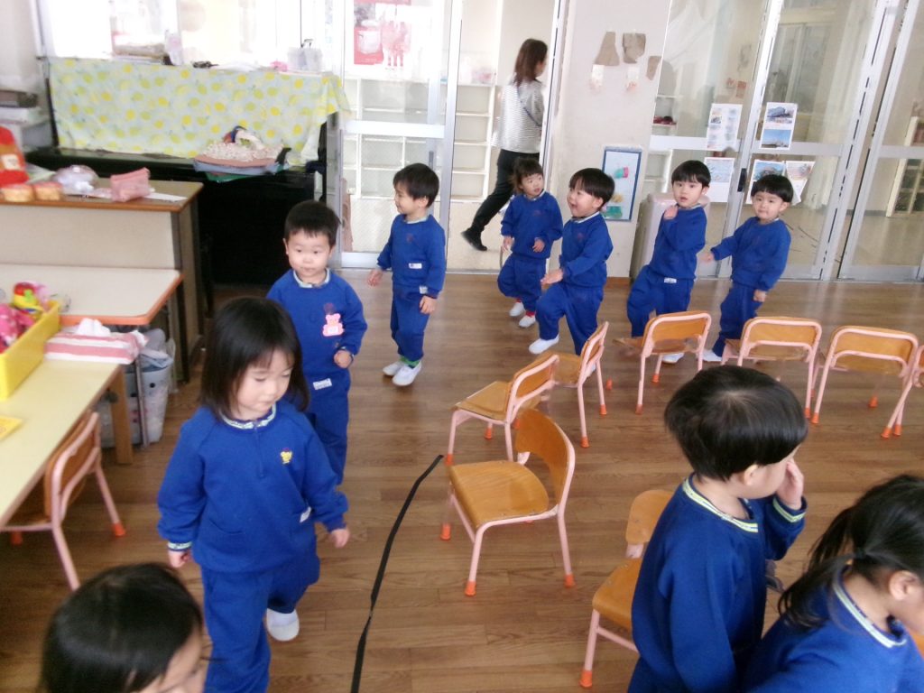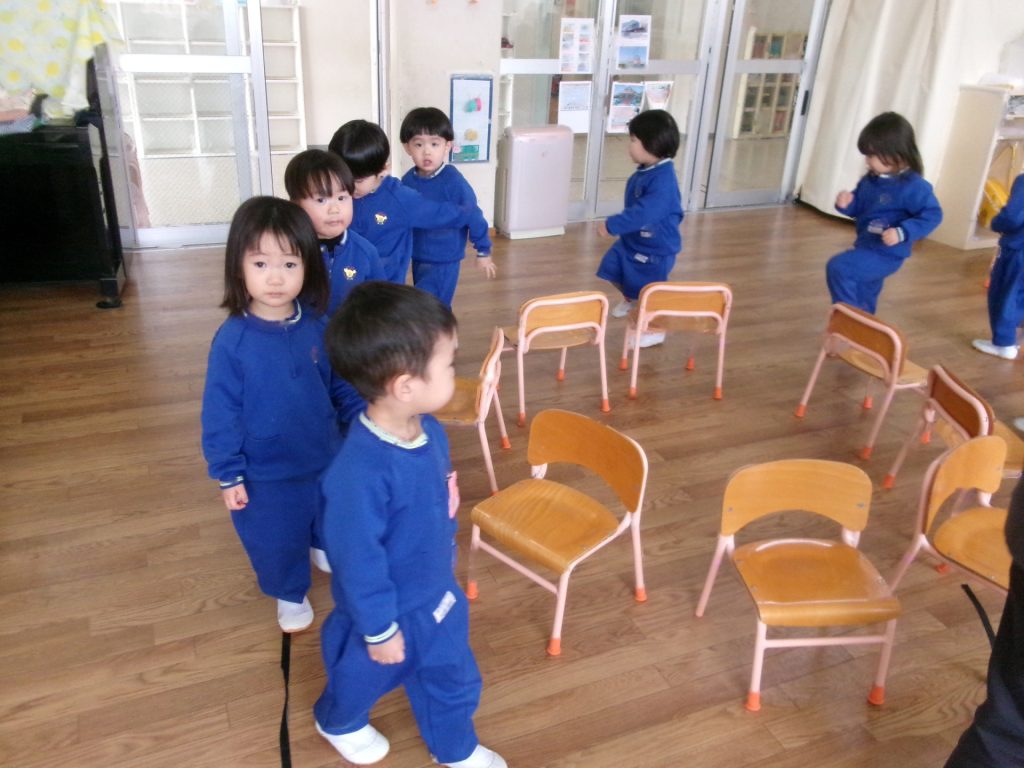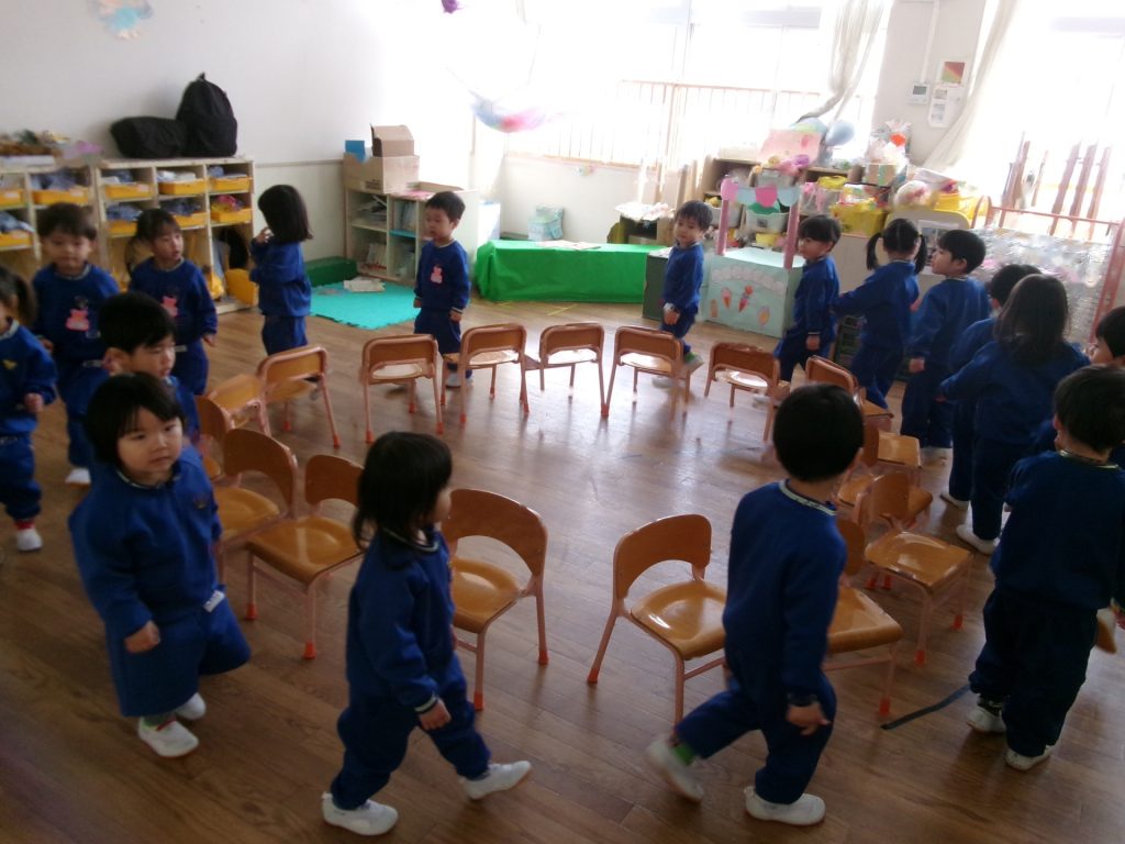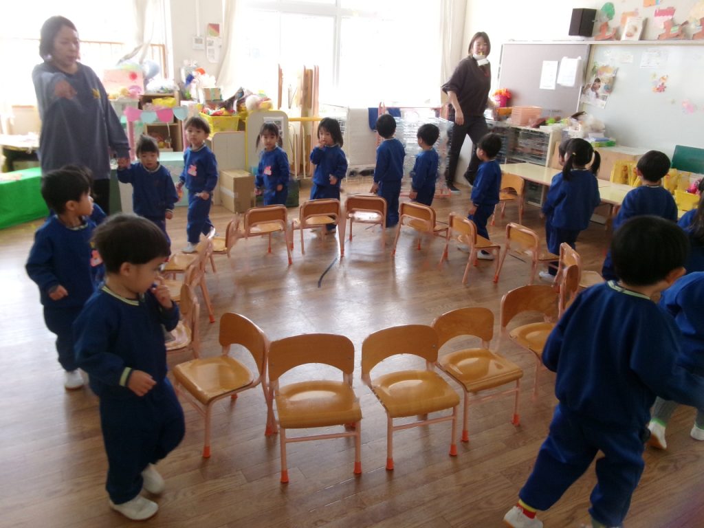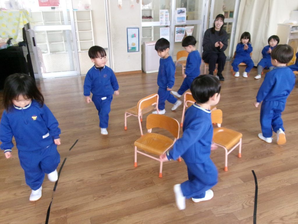 音楽がいつ止まるかな?と少しドキドキしながら周りを歩く子ども達です。曲が止まったと同時に空いている椅子を見つけて…!