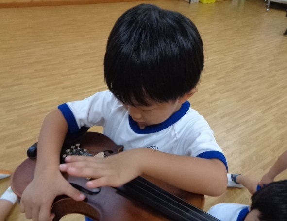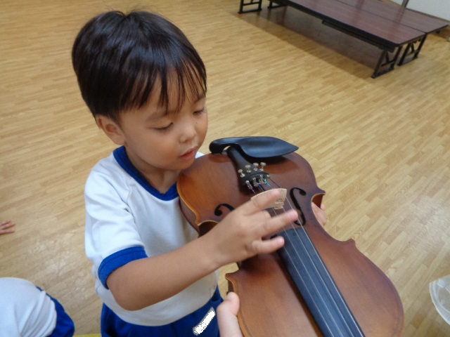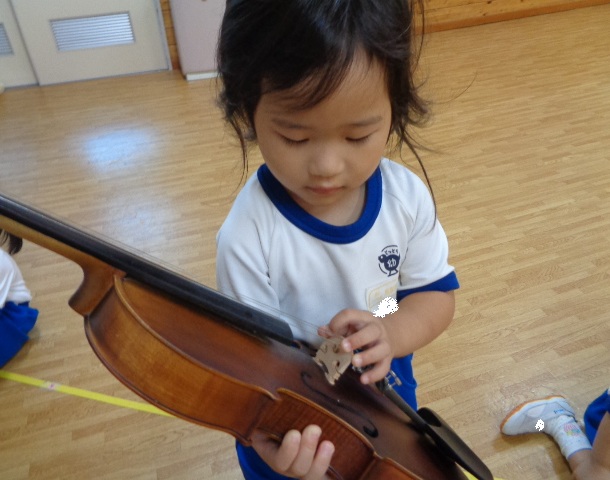 ヴァイオリンの音色を聴いたり、触れてみたり…♪はじめて触れる楽器に、ドキドキな子どもたちでした。