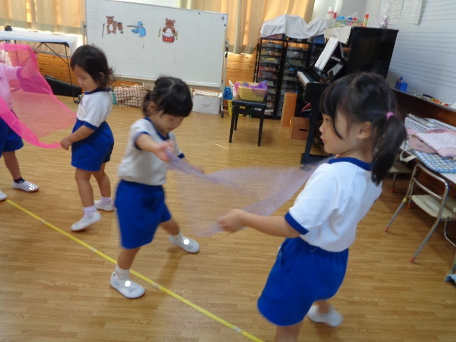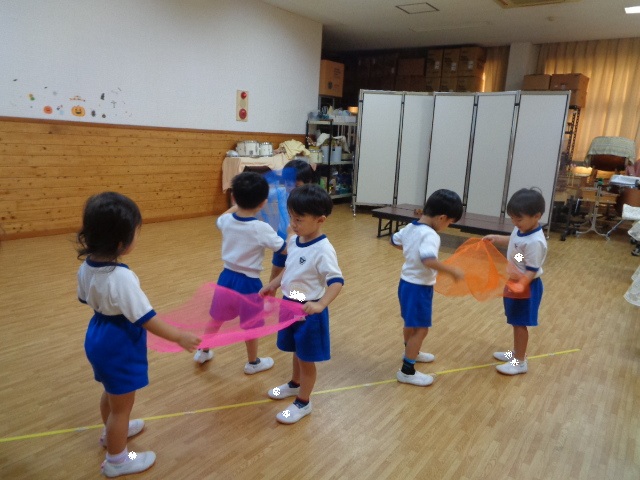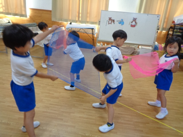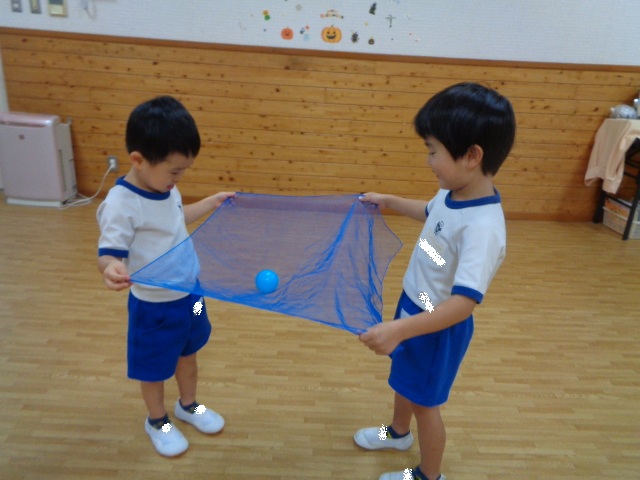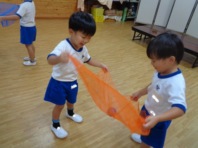 お友達とスカーフをもって、ゆーらんゆーらん♪ボールを落とさないように…