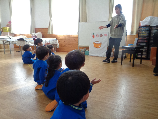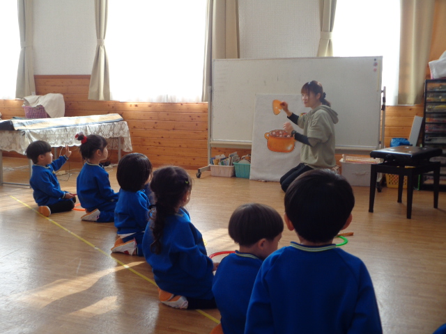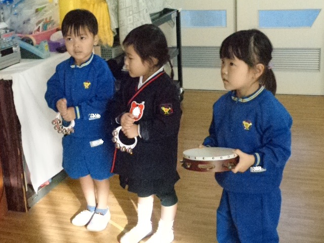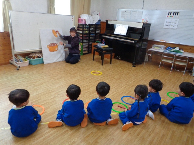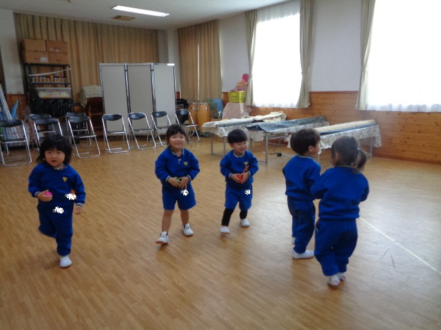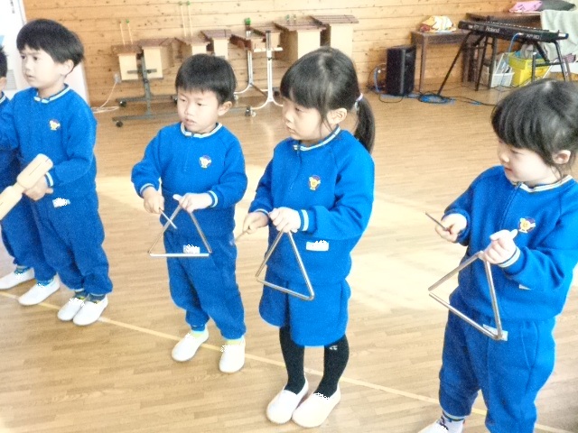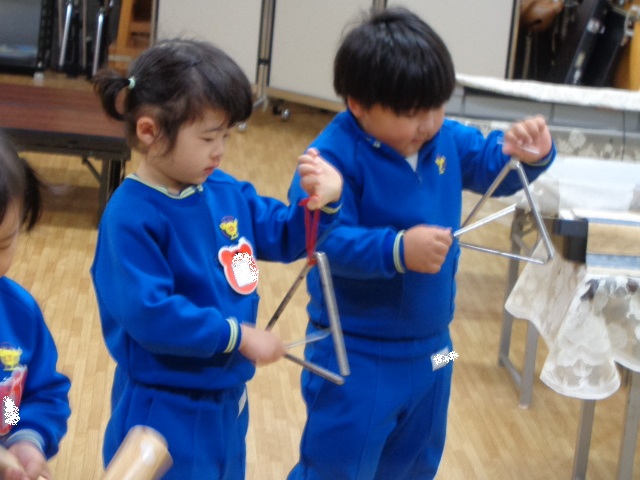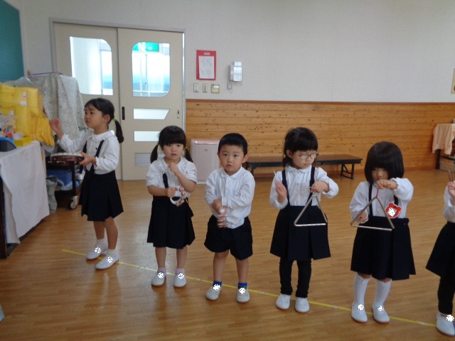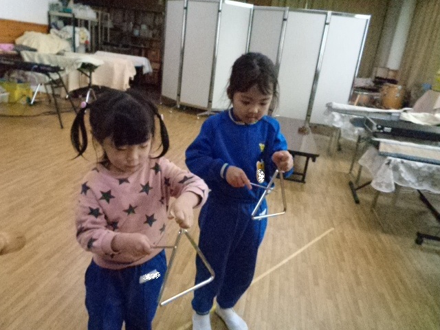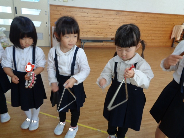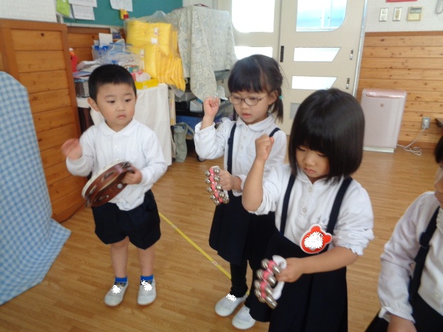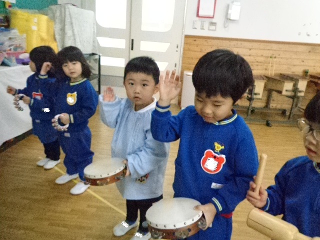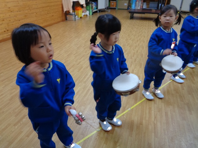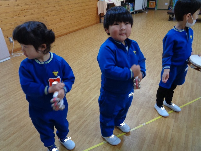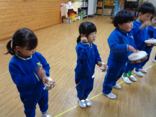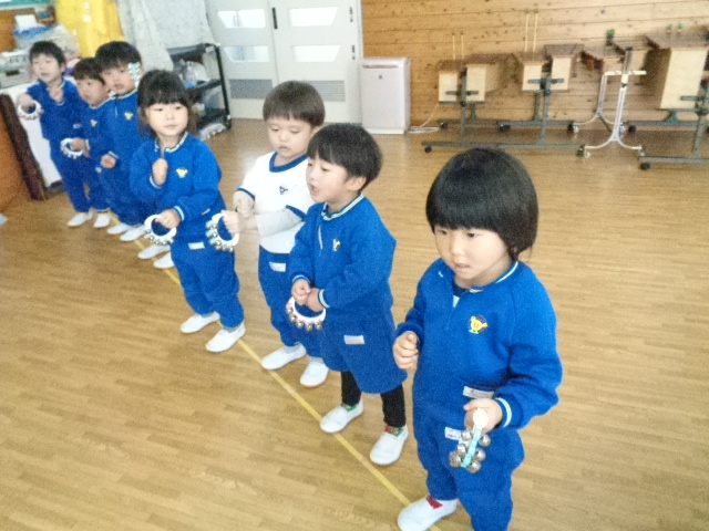 ~2歳さん~ 音楽発表会、とっても素敵でしたね!子ども達の一生懸命な姿がに感動しました。今日は、すずやタンブリンを使って簡単なリズムを鳴らし、楽器あそびをしました。