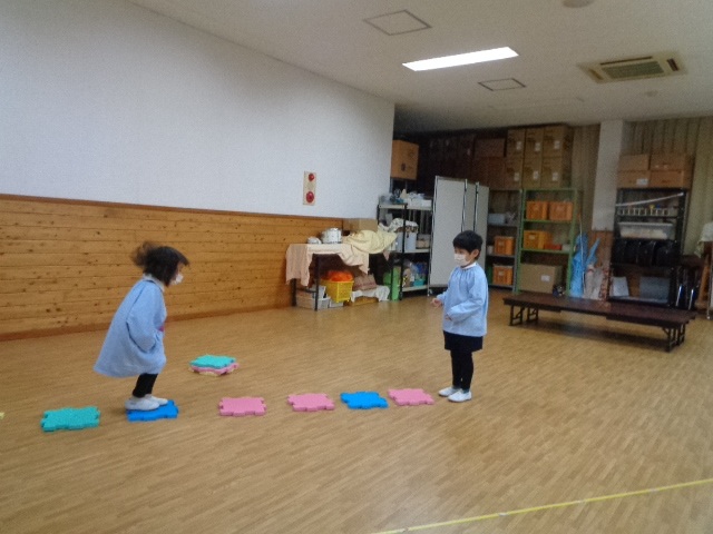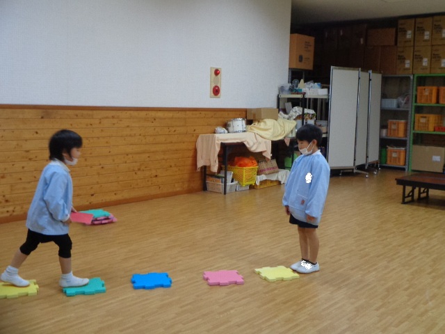 お友達にお手紙を届けます♪音楽に合わせて、タイミングよくジャンプして届けました!