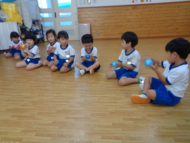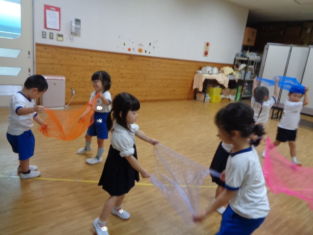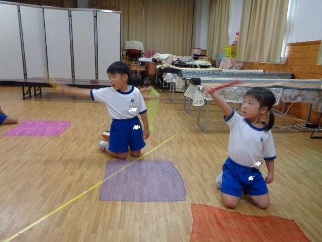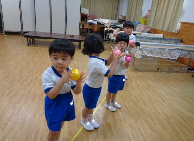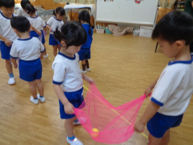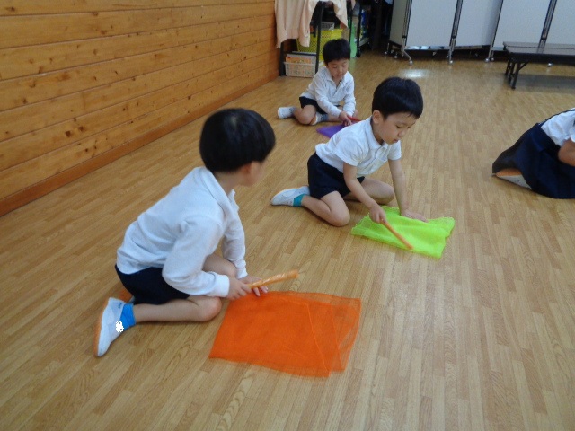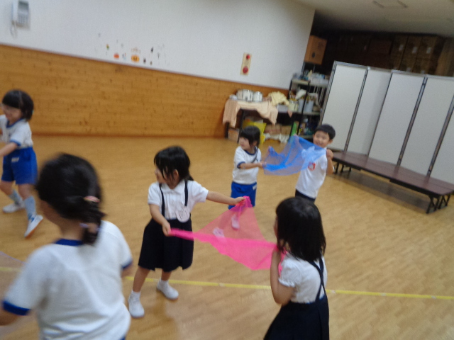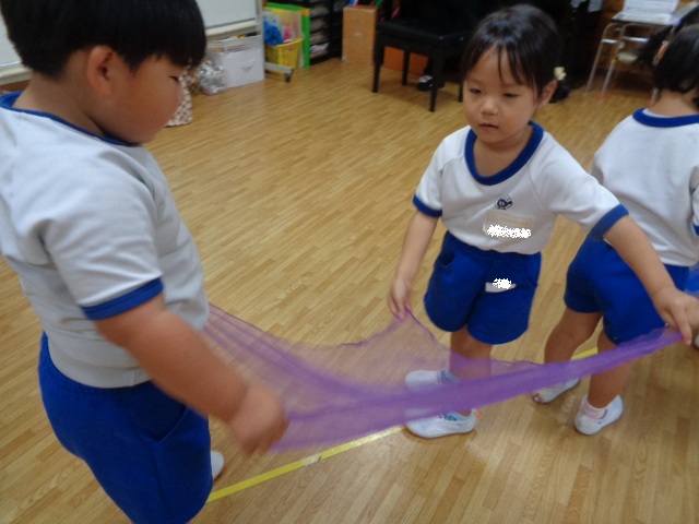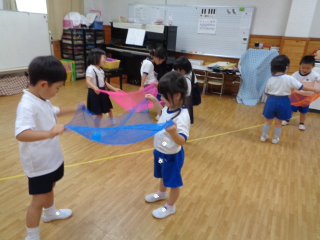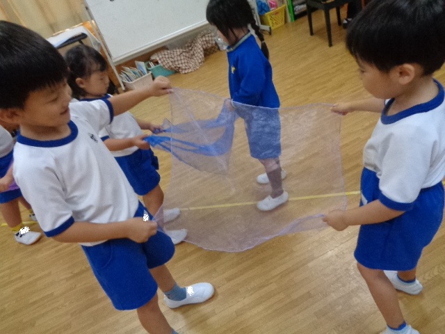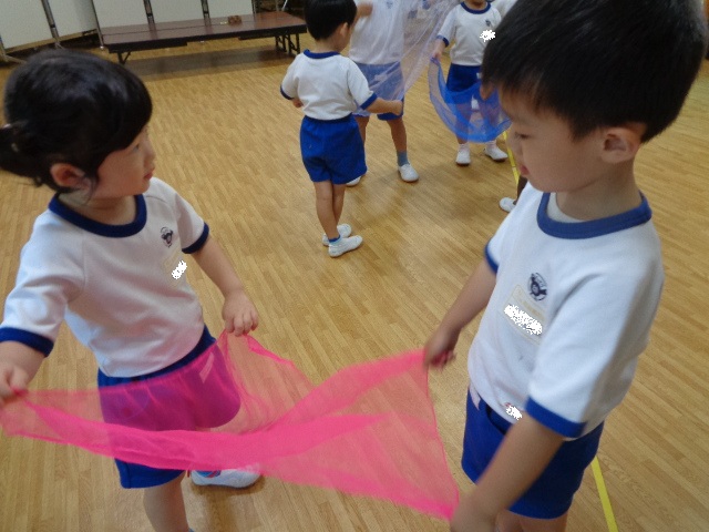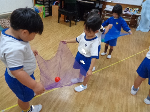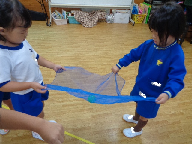 お友達とスカーフをもって、ゆーらんゆーらん♪ボールを落とさないように…
