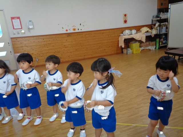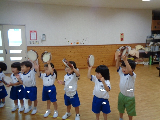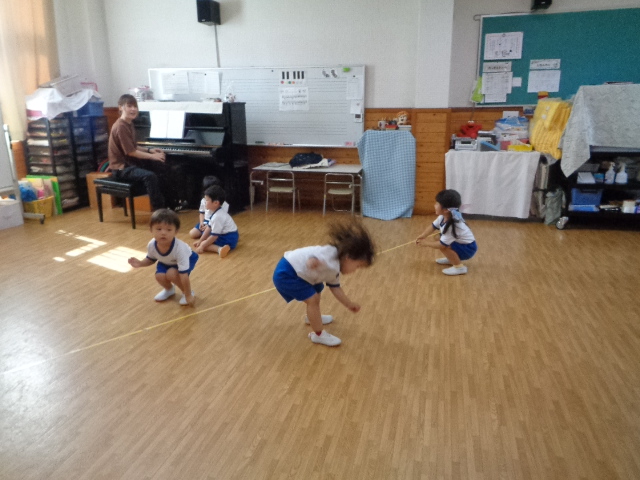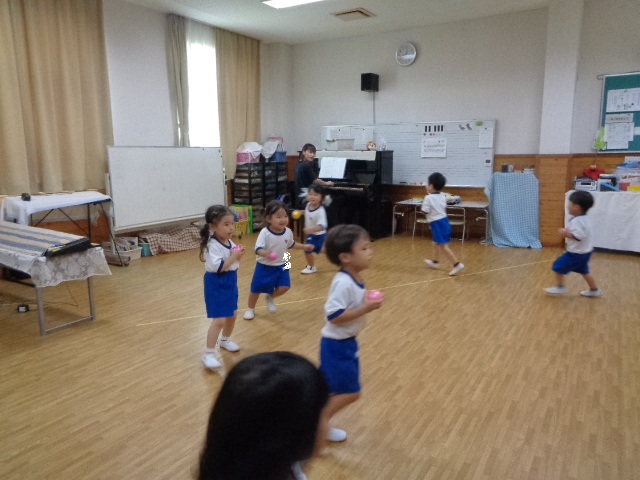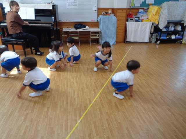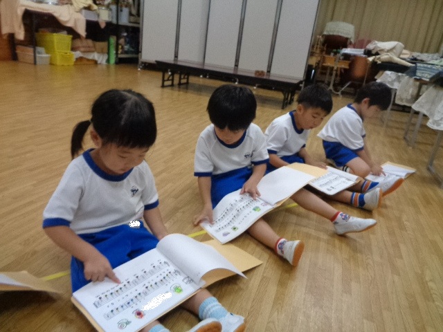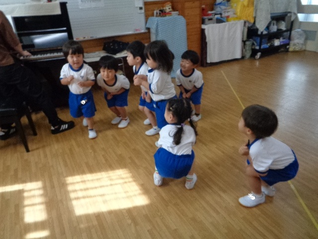 ~年中さん~ 山の音楽家の歌を歌いました。楽器を弾く真似が上手です♪