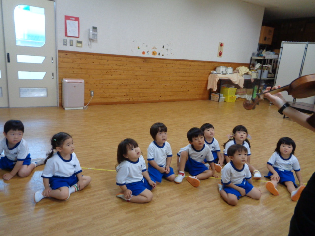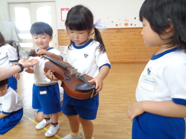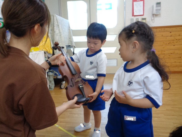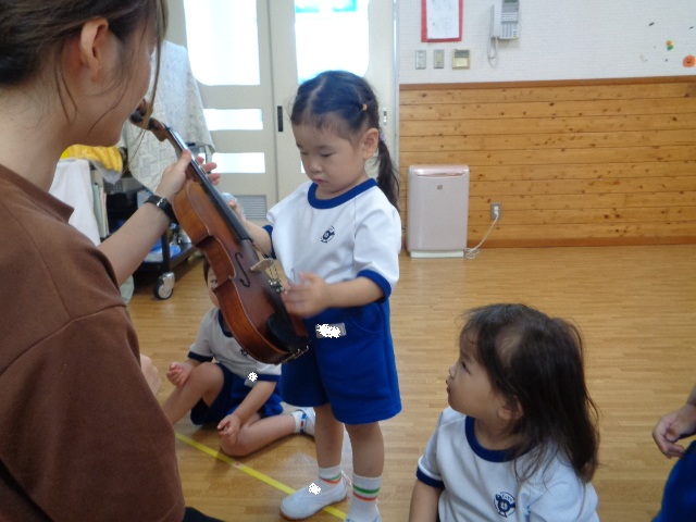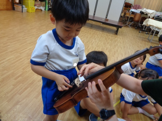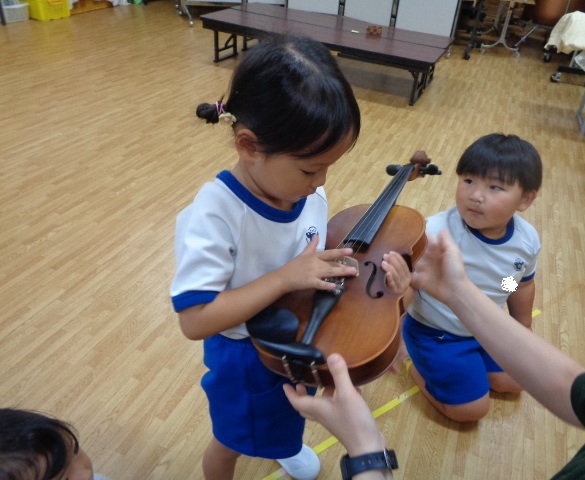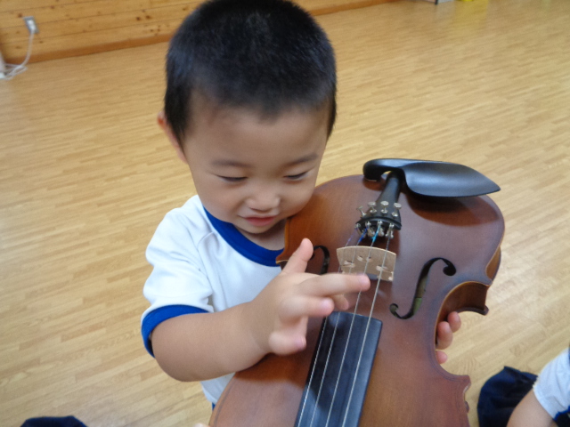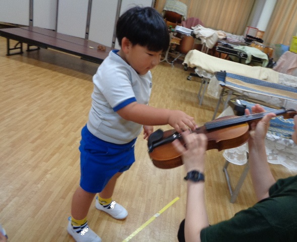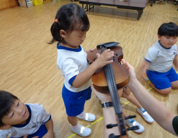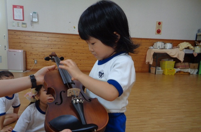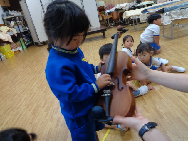 ヴァイオリンの音色を聴いたり、触れてみたり…♪はじめて触れる楽器に、ドキドキな子どもたちでした。