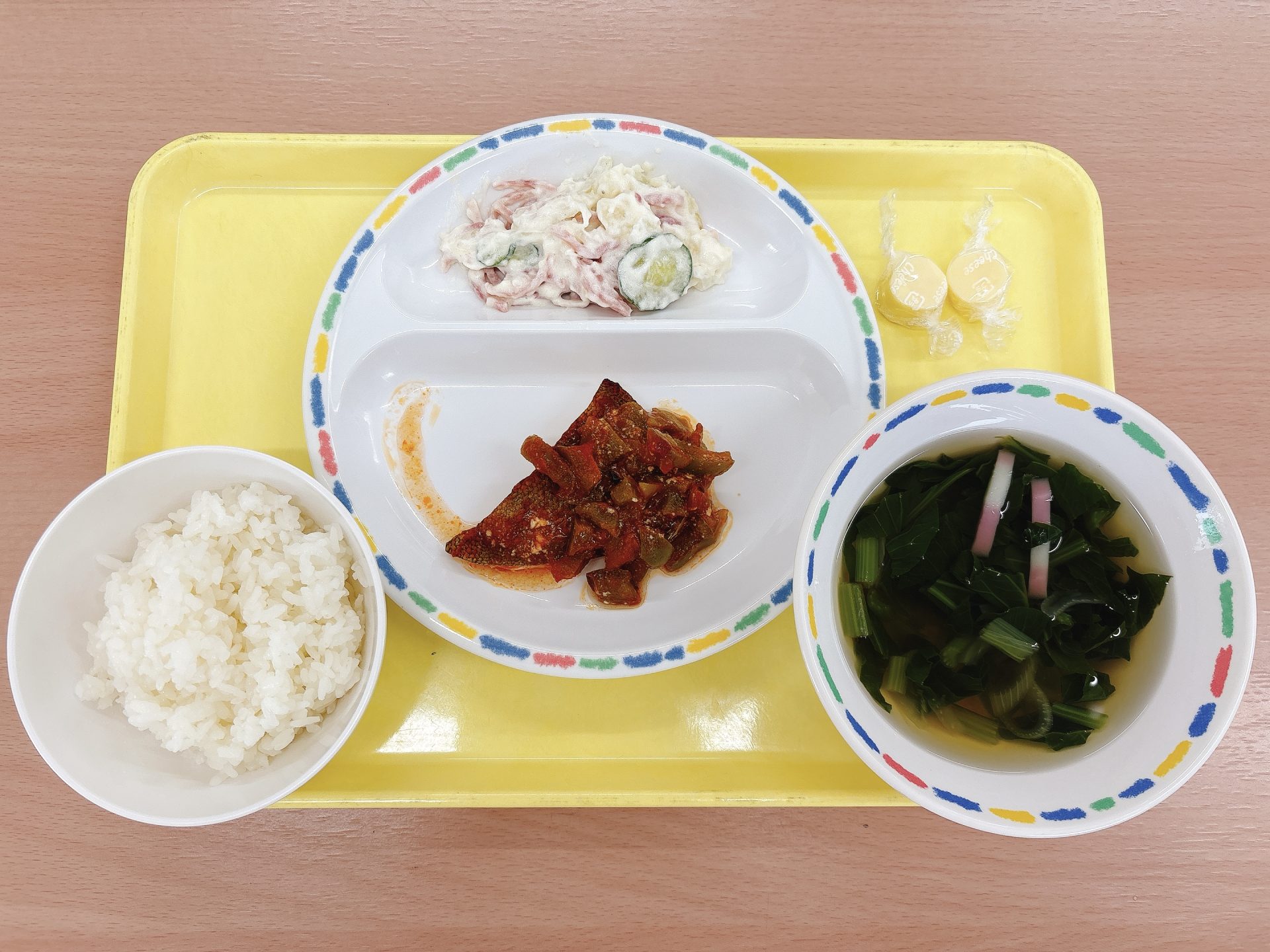 トマトの日メニュー:今日はトマトの日なので、トマトソースで味付けをしたかれいです🐟🍅