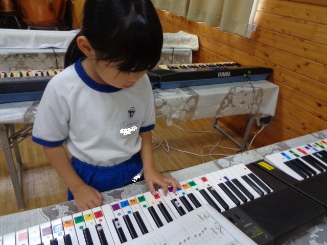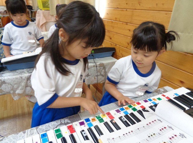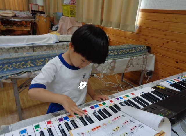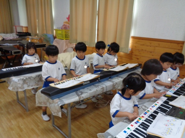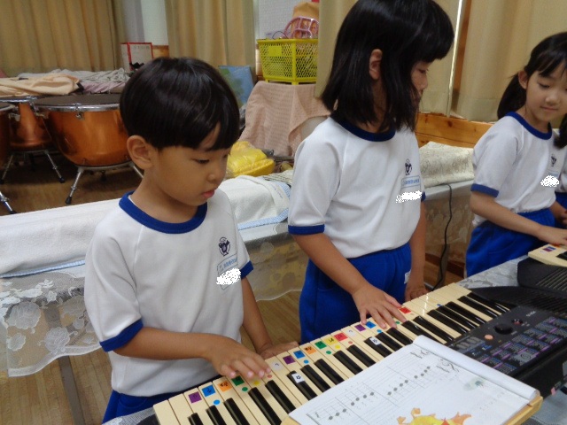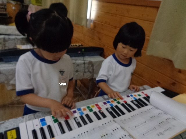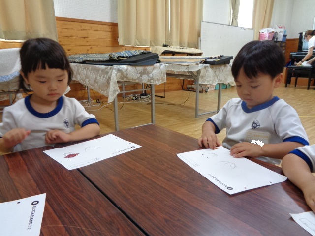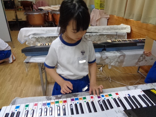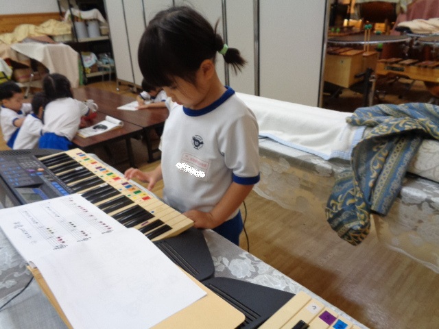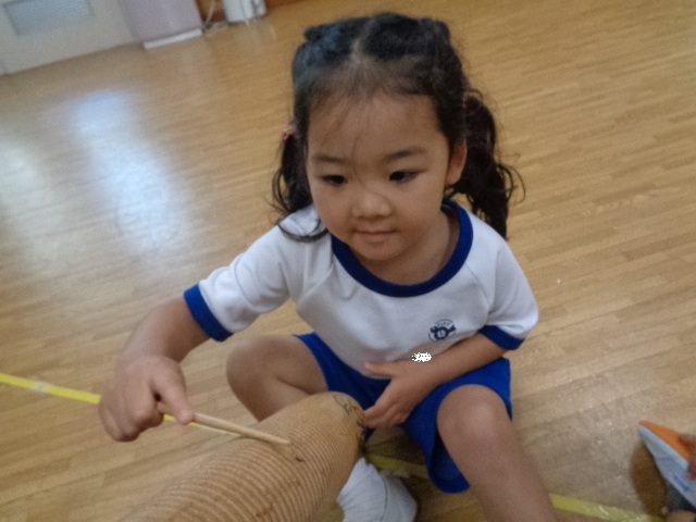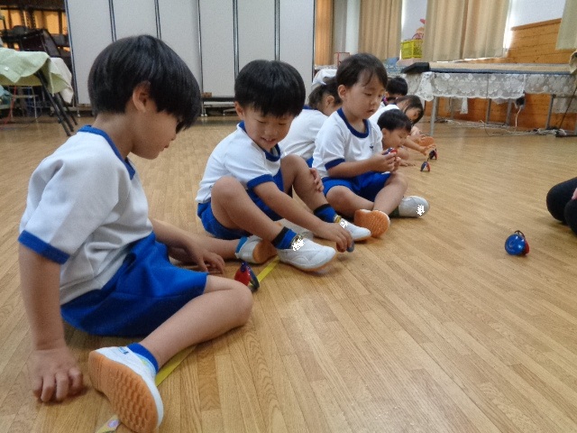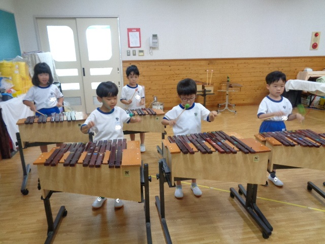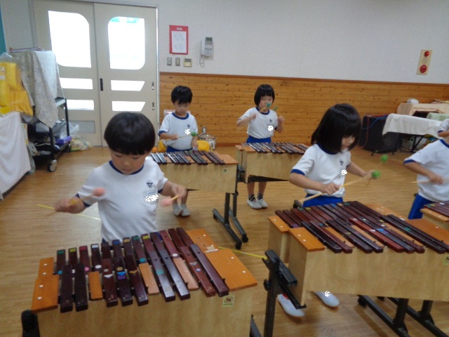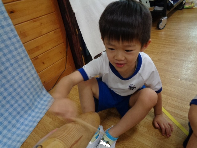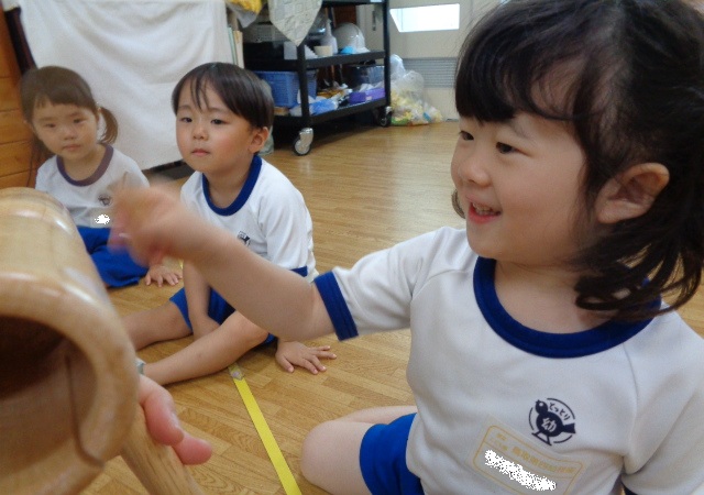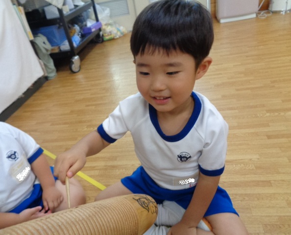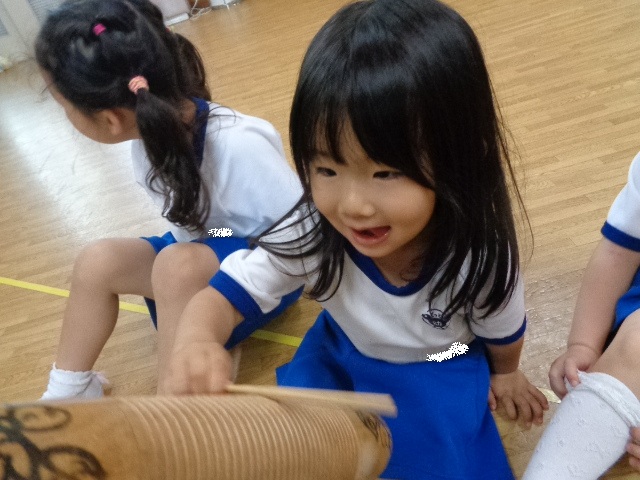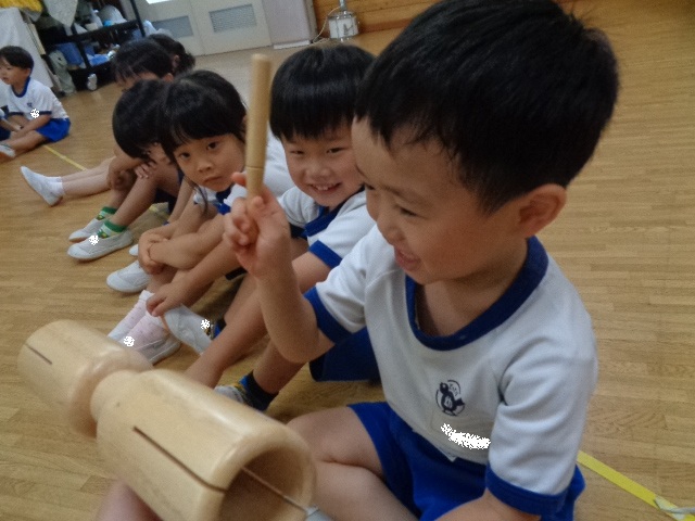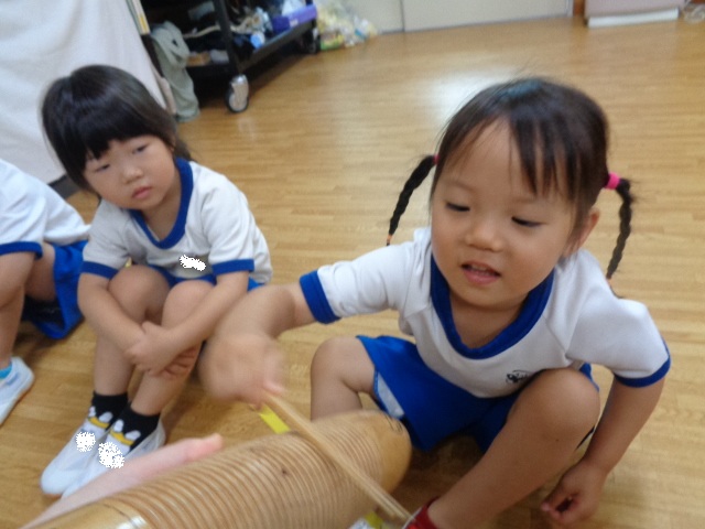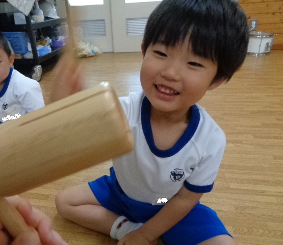 ~年少さん~ ギロにチャレンジ!音色が予想外だったようで、音が鳴るとお友達と顔を見合わせて笑っていました♪