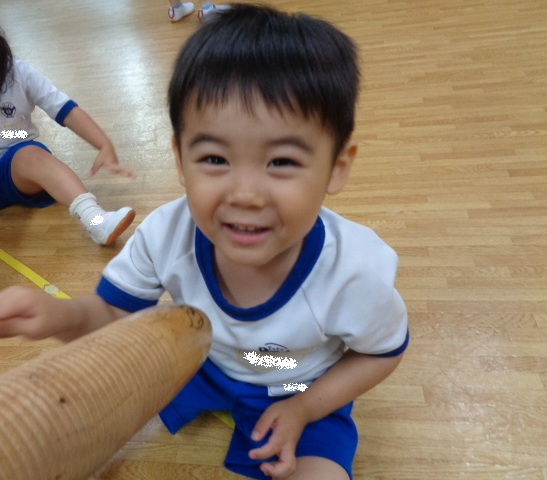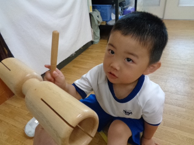 ~年少さん~ ウッドブロックにチャレンジ。右と左で音が違うことに気づき、にこっと笑っていました♪