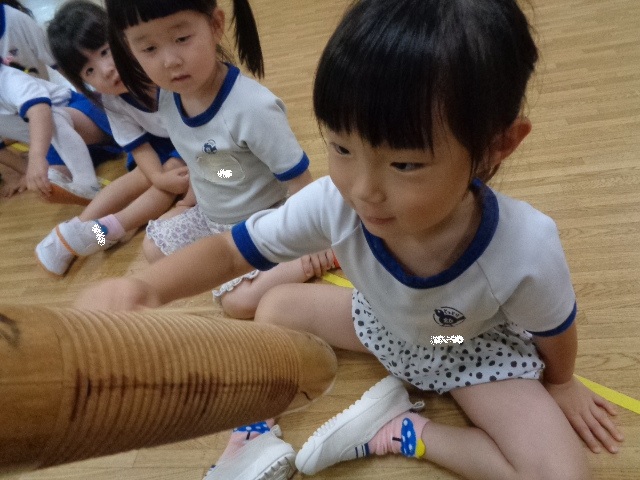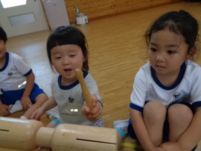 ~年少さん~ ギロの形や音色に興味深々の子どもたちでした。