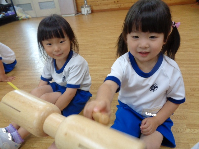 ~年少さん~ ウッドブロックにチャレンジ!左右で音が違うので、「なんかおもしろい!」と子ども達♪