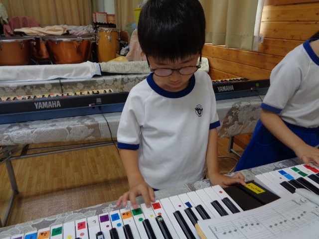 グロッケンやザイロフォンの音色の違いを感じながら「たなばたさま」の演奏をしました。