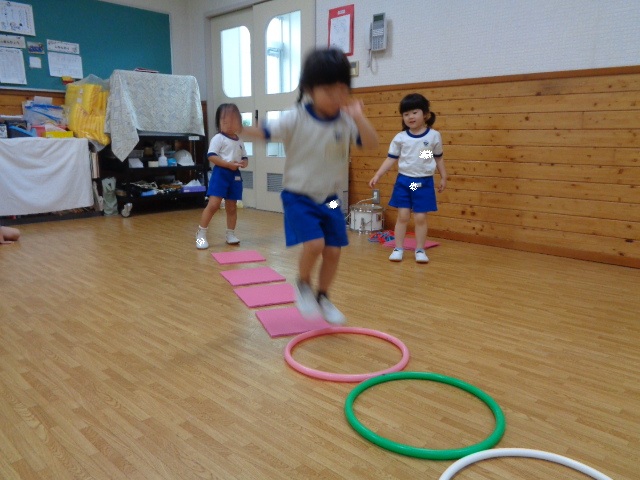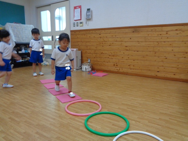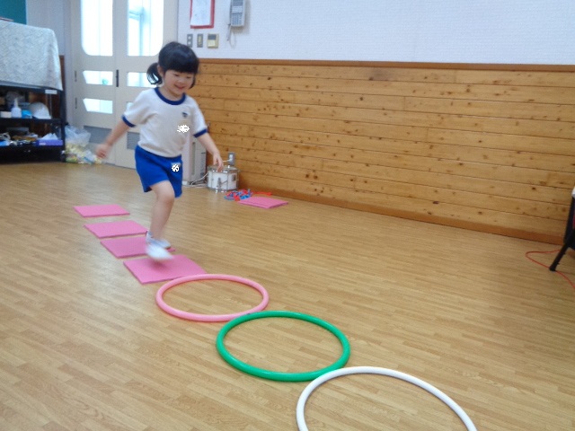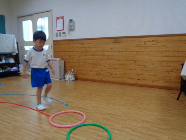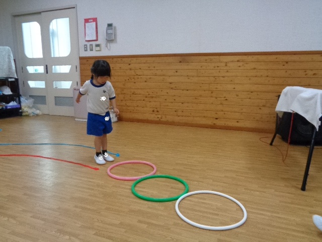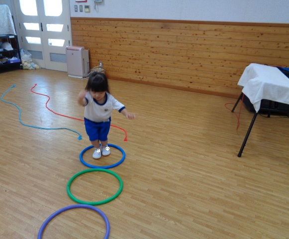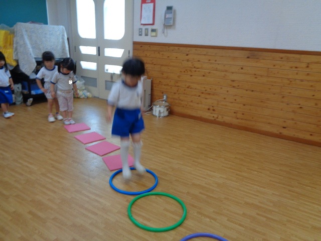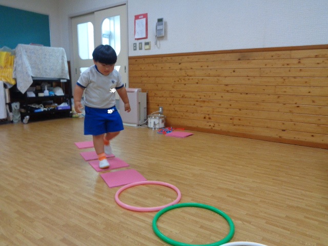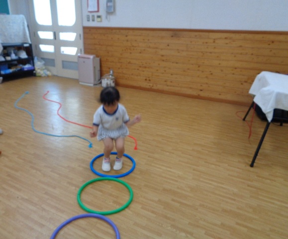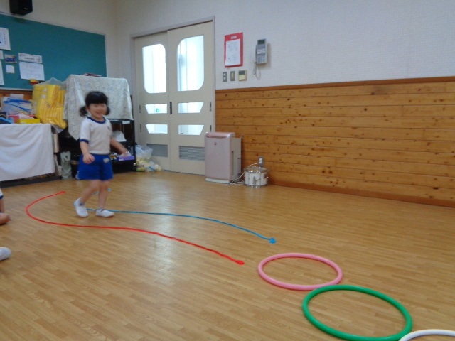 ぐにゃぐにゃ道やフープの道、ボードの道など色々な道を歩いたりジャンプしたりして表現しました。