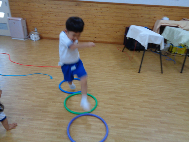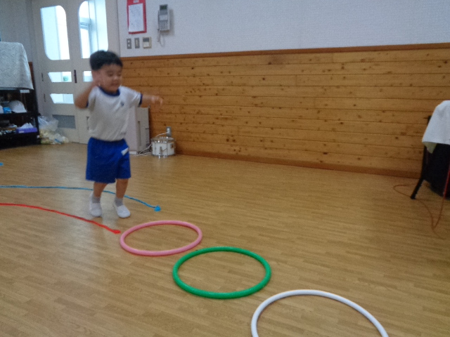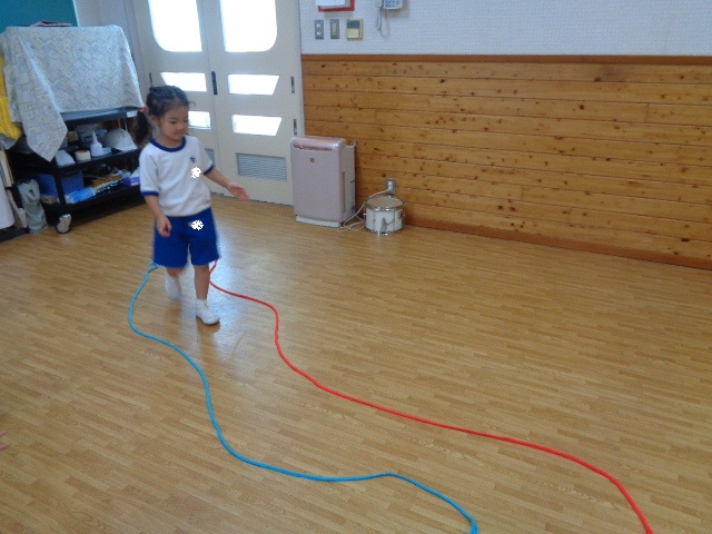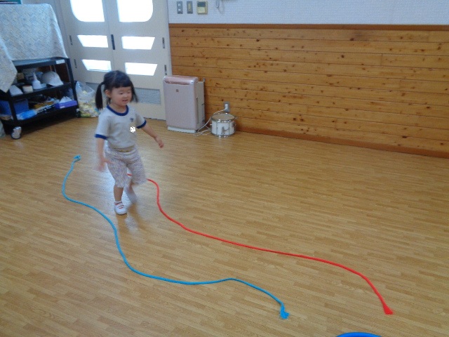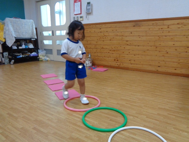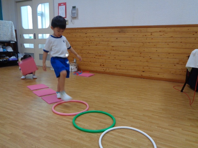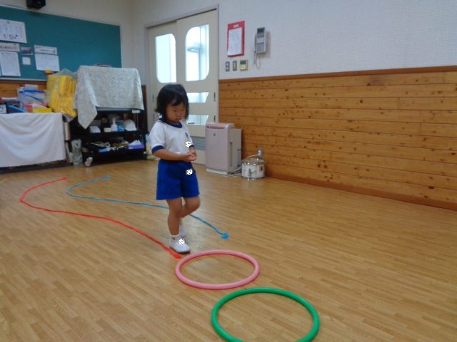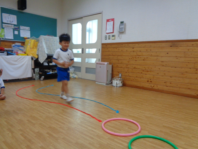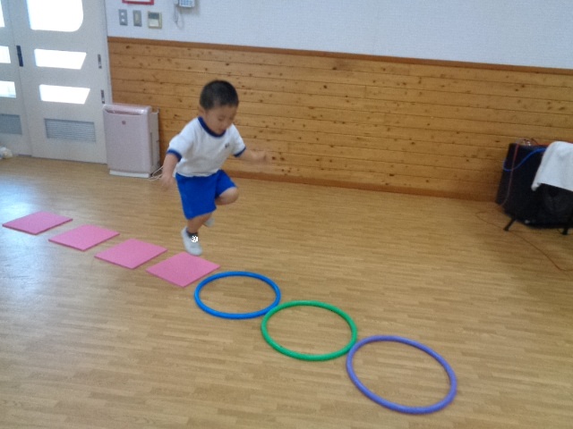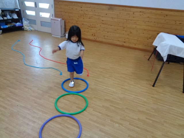 ぐにゃぐにゃ道やフープの道、ボードの道など色々な道を歩いたりジャンプしたりして表現しました。