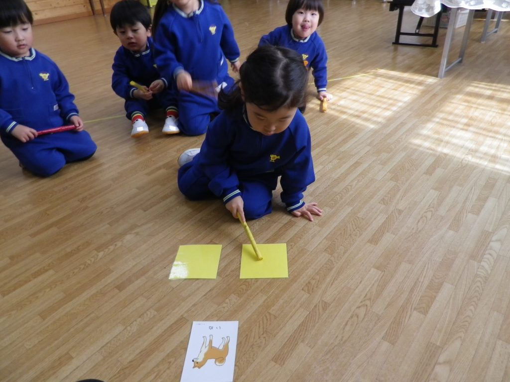 いろいろな言葉のリズムを表現したり、ピアノの音の合図をよく聴いて表現したり…♪