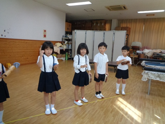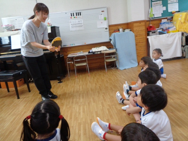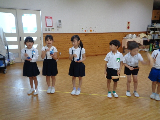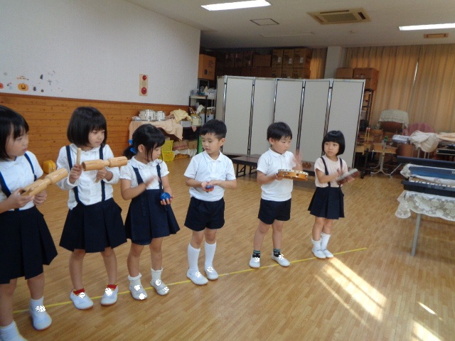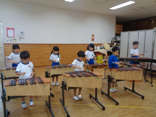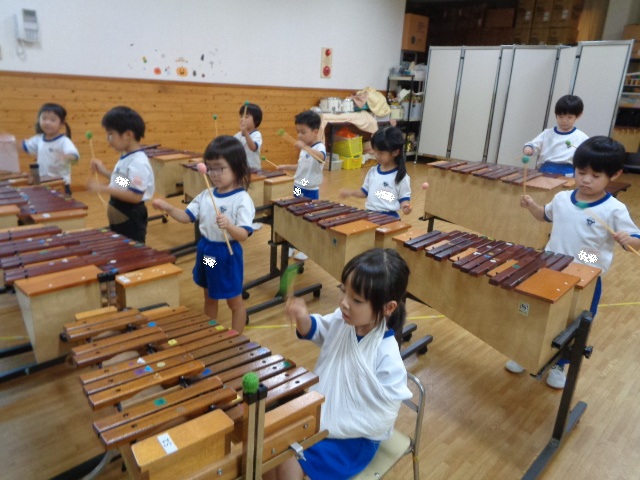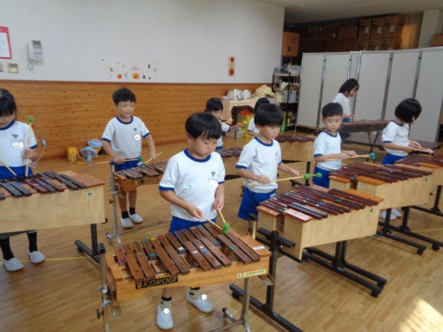 ~年長さん~ 色々な打楽器に分かれて、音色を聴き合ったり、リズムを表現したりしました。自然とお友達の音を聴き合って演奏する年長さん、さすがでした!
