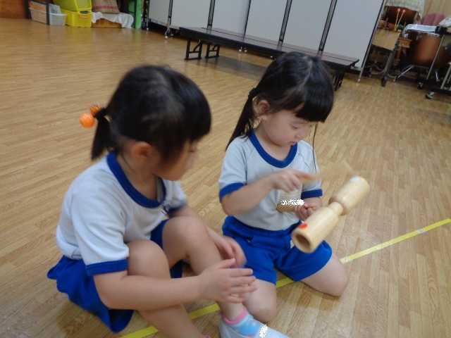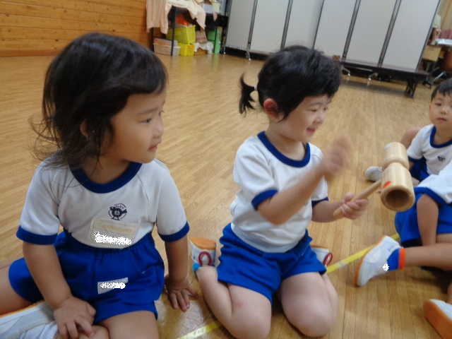 ~年少さん~ ウッドブロックを鳴らしました。左右の音が違うことに気づき、にこっと笑顔でした♪