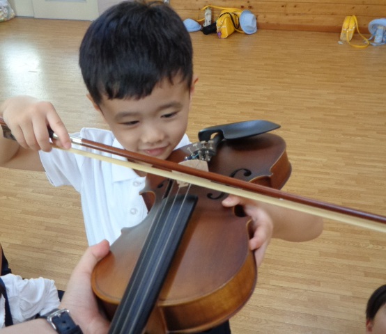 山の音楽家の歌にちなんで、色々な楽器の名前が出てきました。今日は本物のヴァイオリンにも触れました!