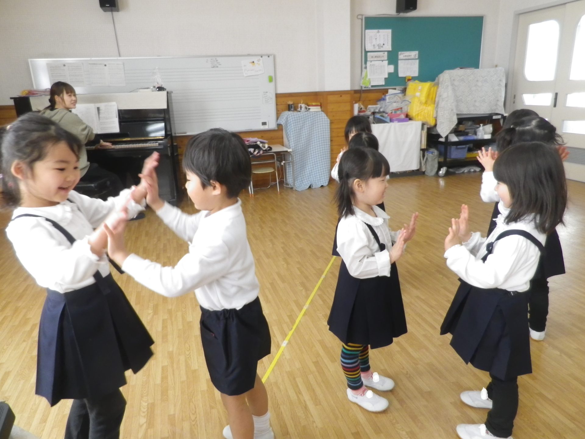 いろいろな言葉のリズムを表現したり、ピアノの音の合図をよく聴いて表現したり…♪
