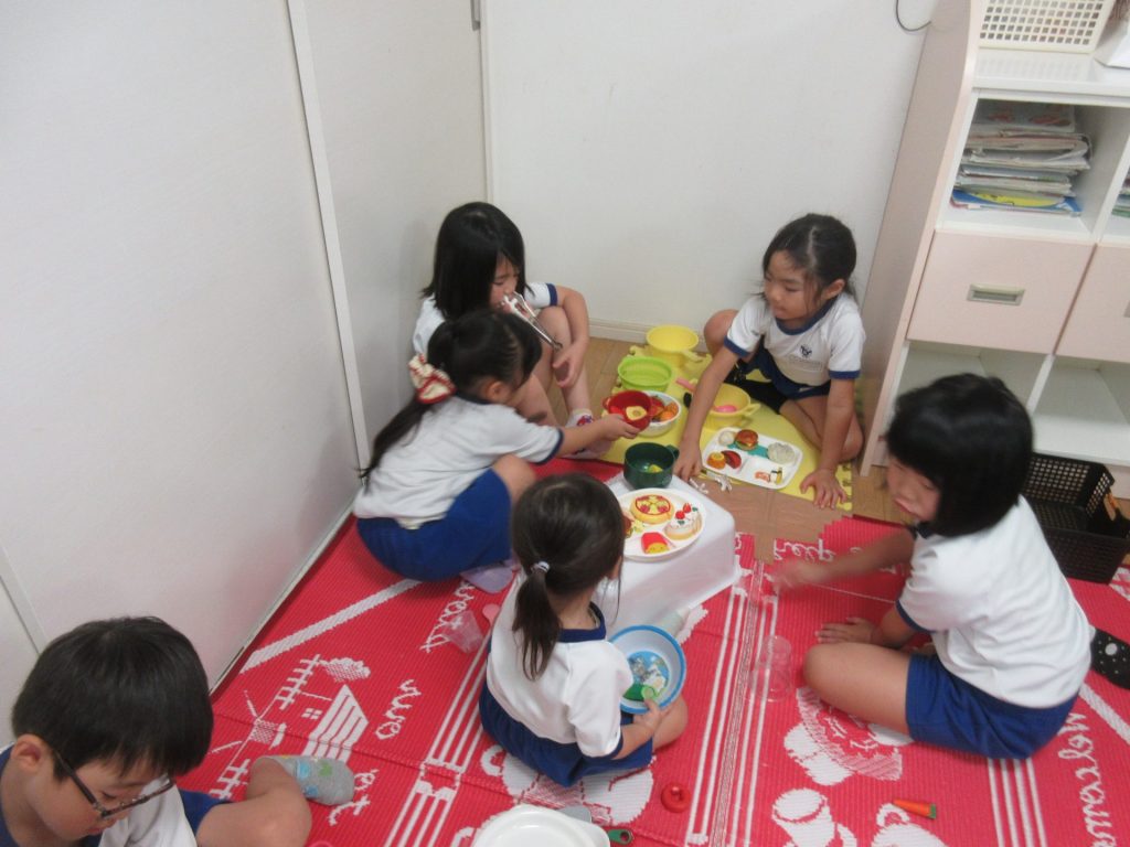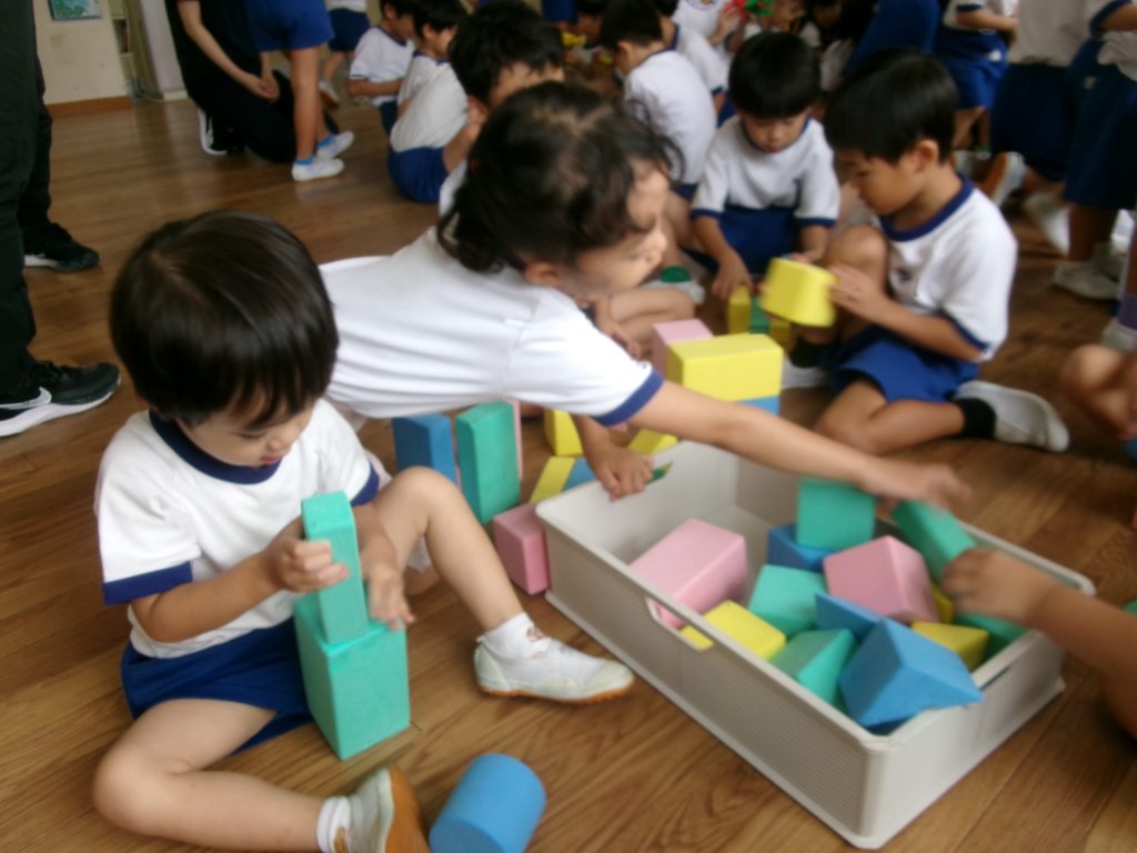 一緒にうたを歌ったり、触れ合い遊びを楽しんだりした後は、ブロックやままごとなど好きな遊びをみんなで楽しみました♪