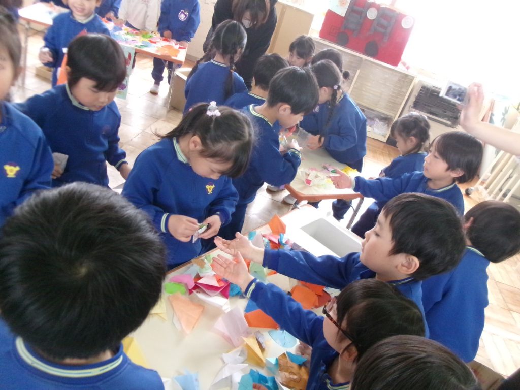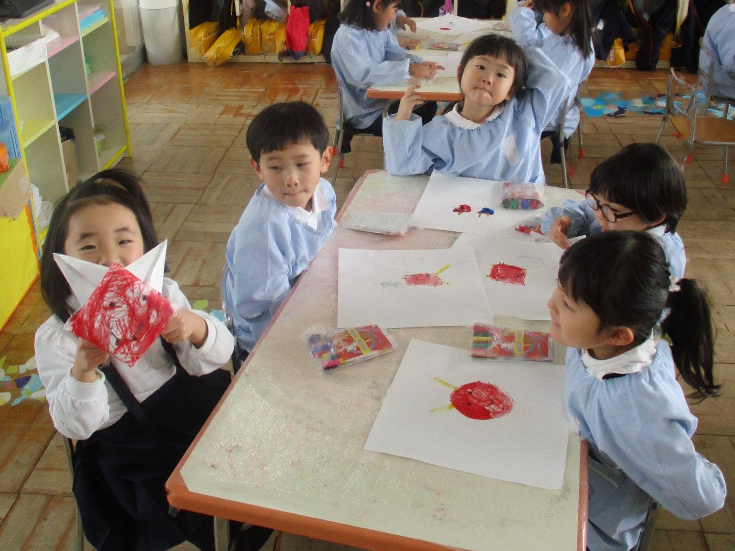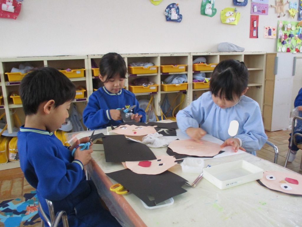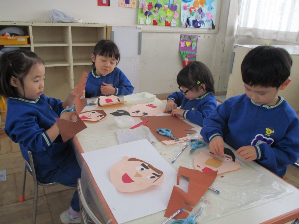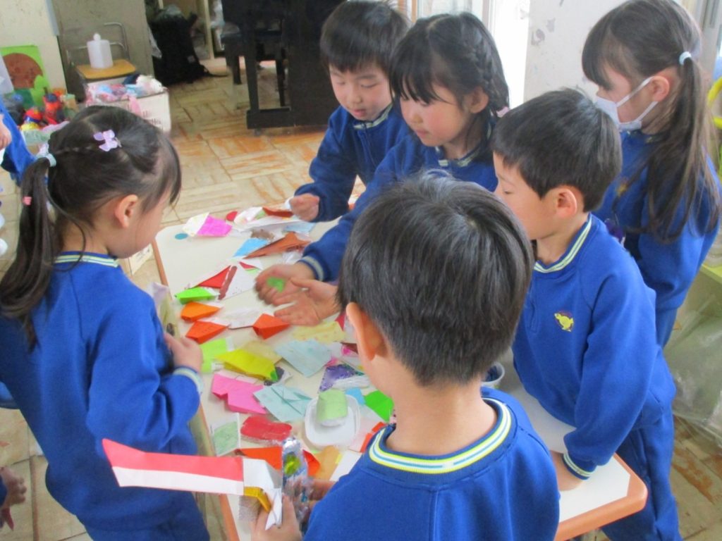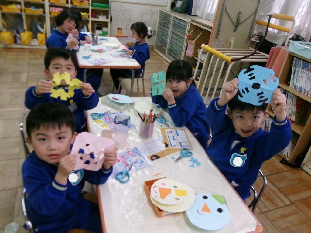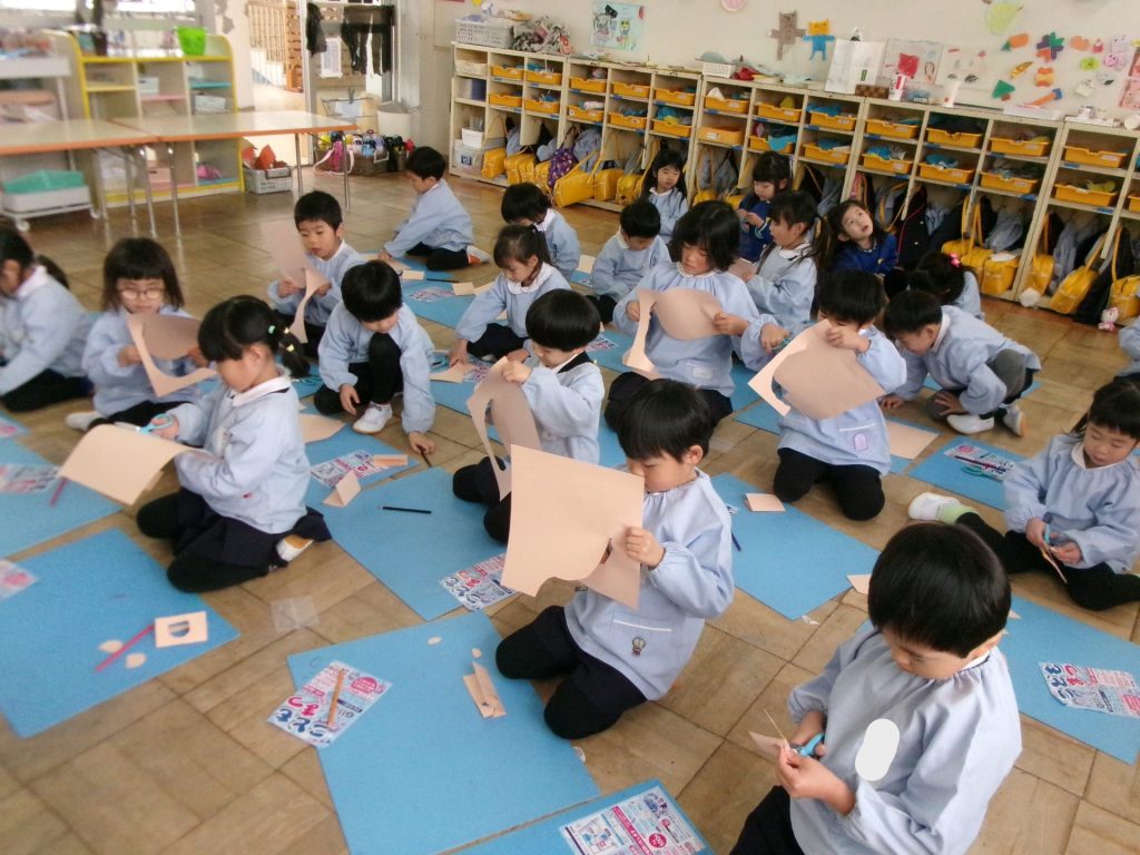 先日の節分に向けて、年中組は升を作りました。大きな紙に節分に関する絵を描き、それを折りました。日ごろの遊びで折り紙を楽しんでいるため、難しい折り方にも楽しんで取り組む姿が見られましたよ😊