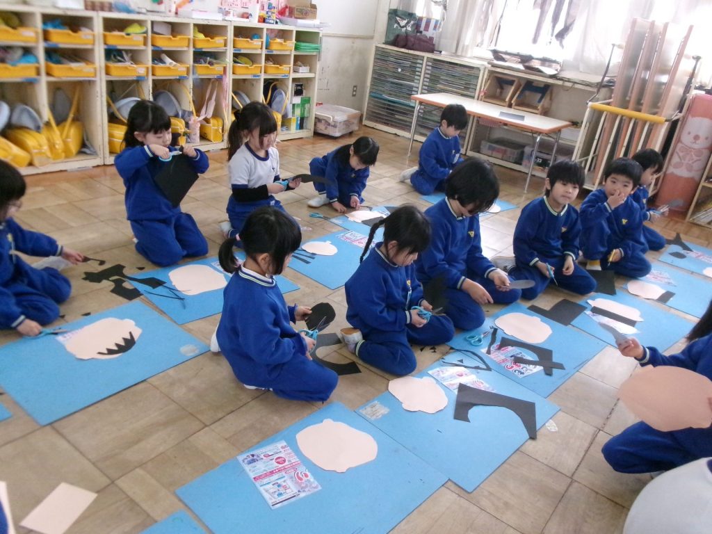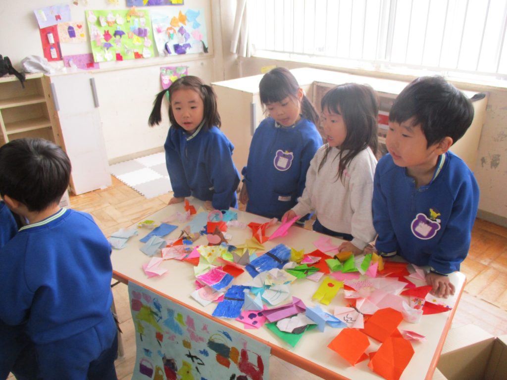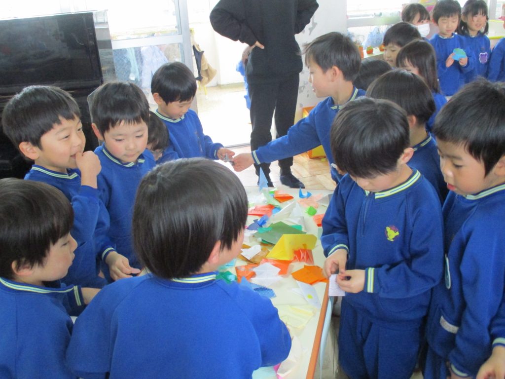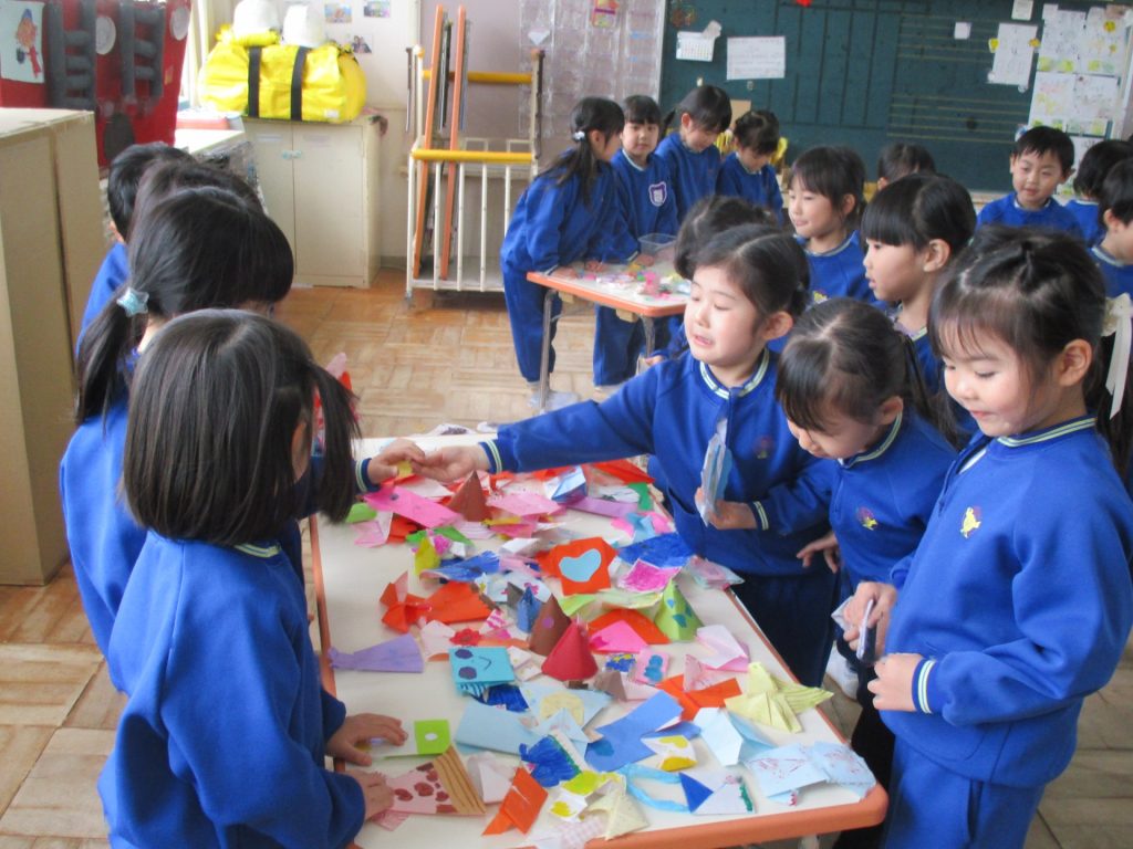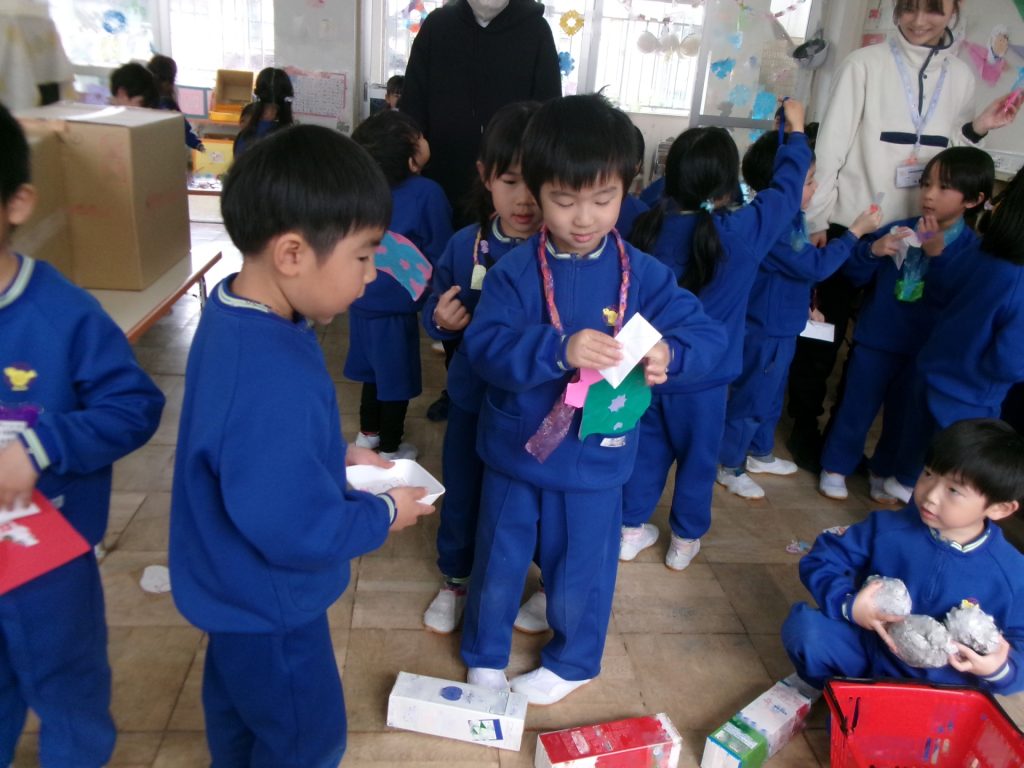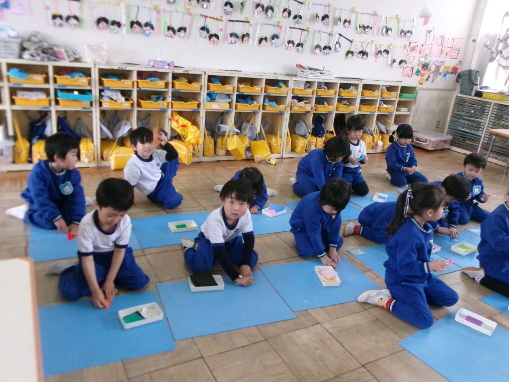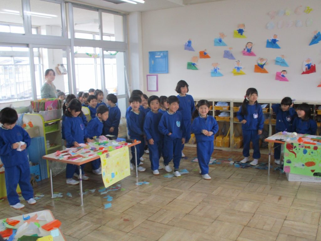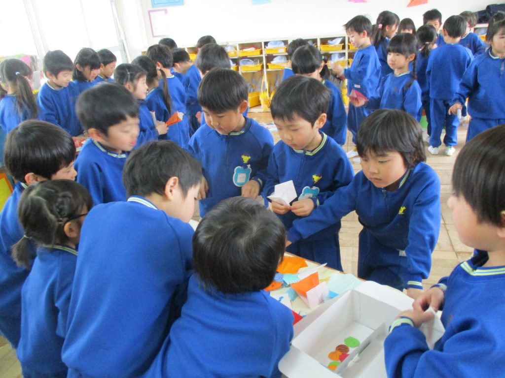 先日の節分に向けて、年中組は升を作りました。大きな紙に節分に関する絵を描き、それを折りました。日ごろの遊びで折り紙を楽しんでいるため、難しい折り方にも楽しんで取り組む姿が見られましたよ😊