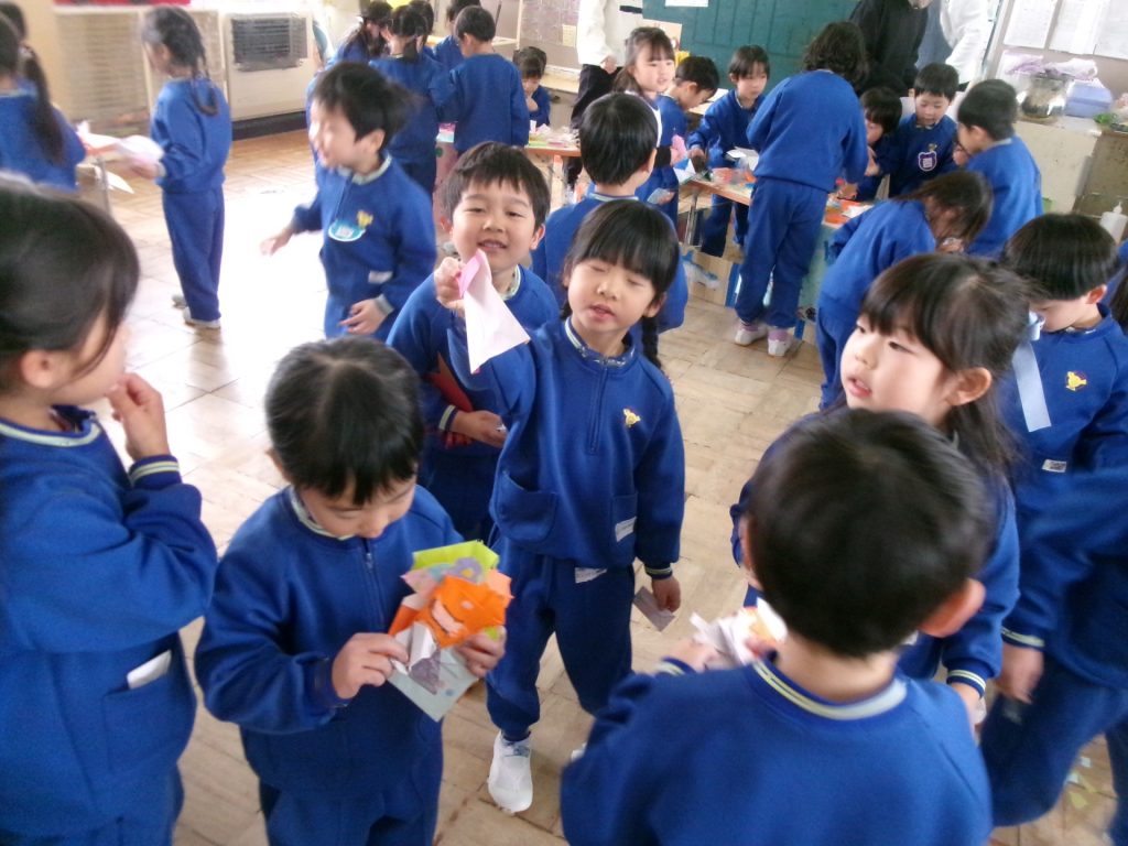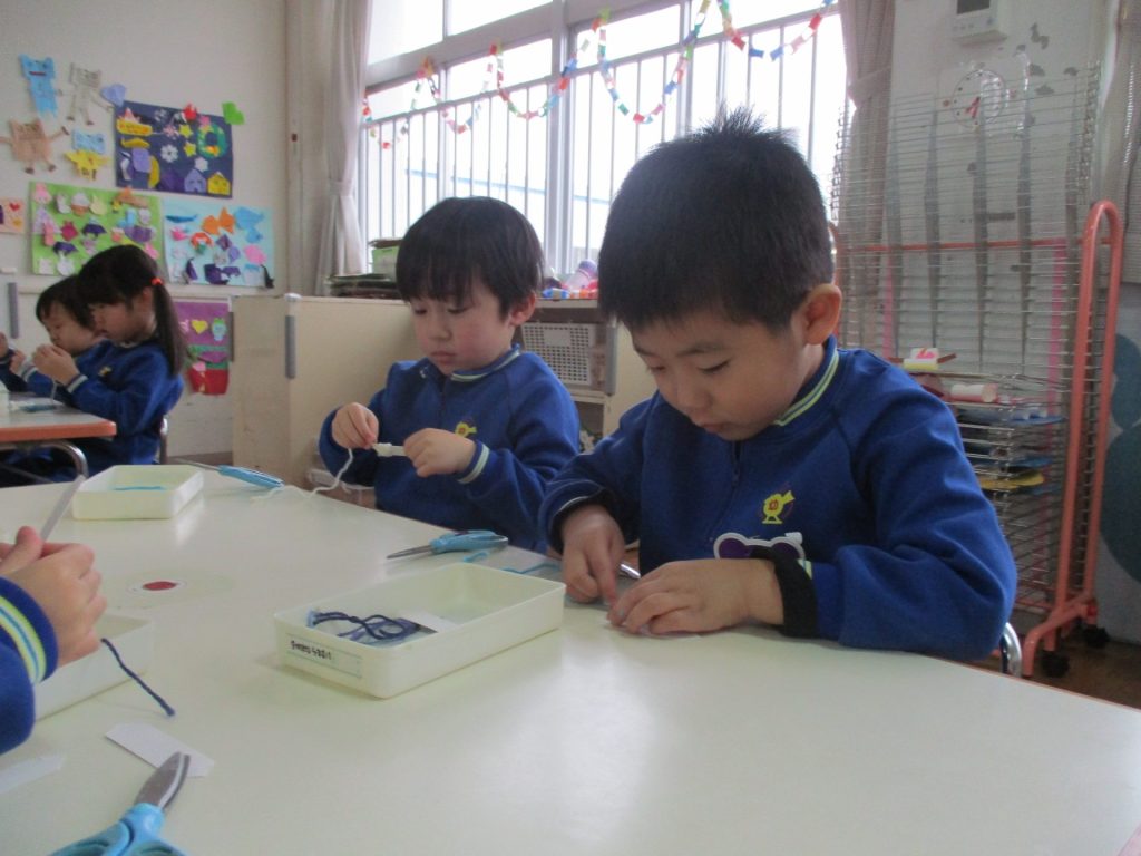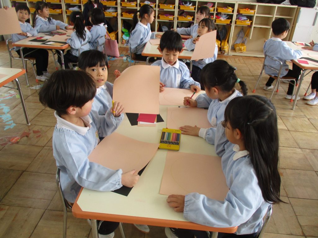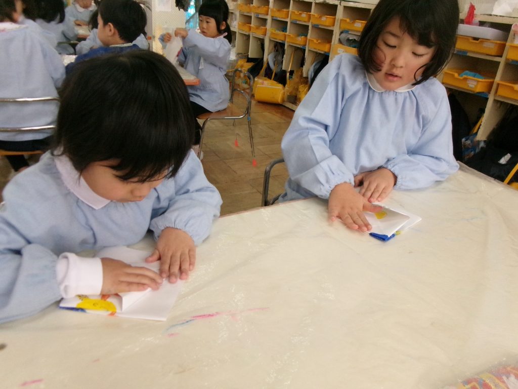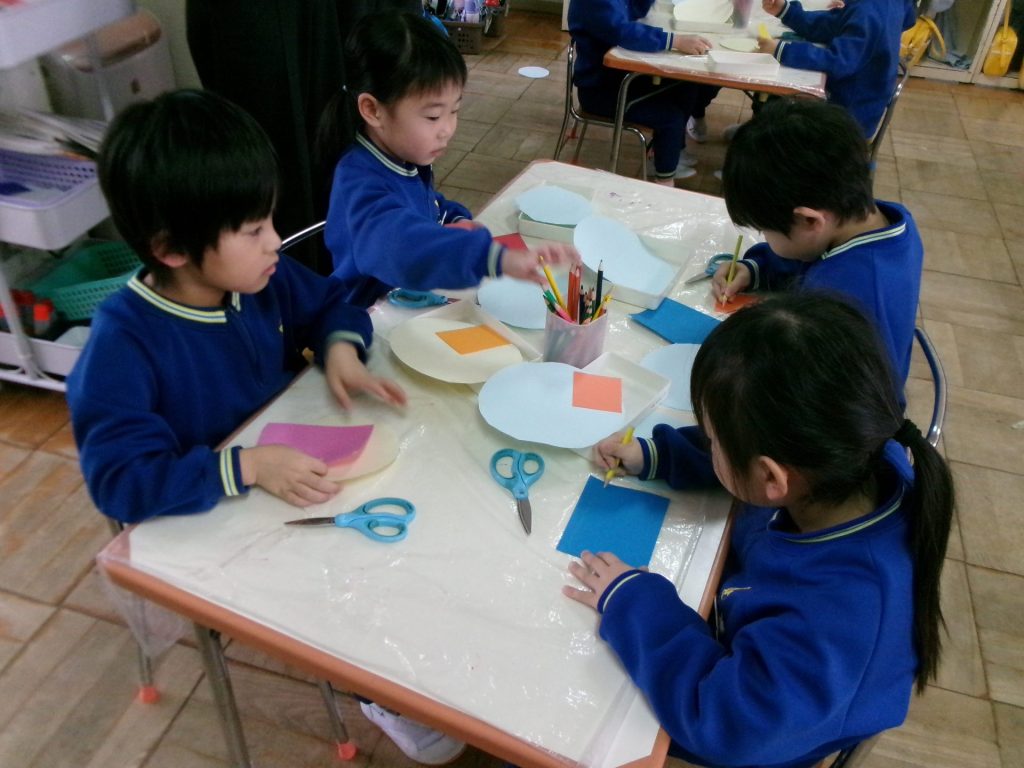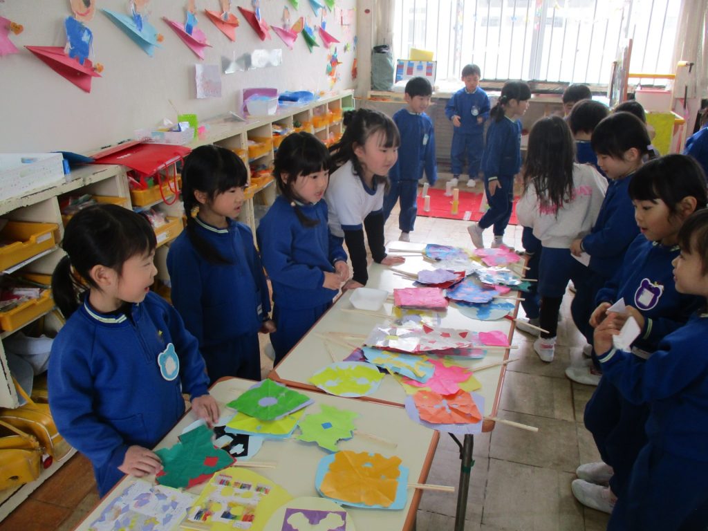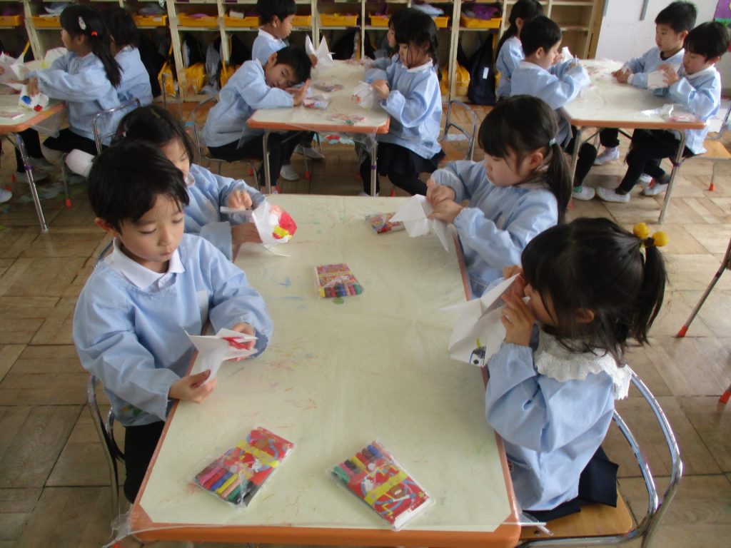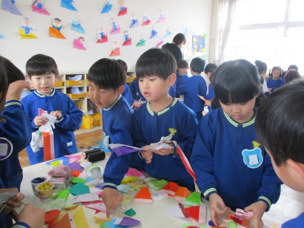 先日の節分に向けて、年中組は升を作りました。大きな紙に節分に関する絵を描き、それを折りました。日ごろの遊びで折り紙を楽しんでいるため、難しい折り方にも楽しんで取り組む姿が見られましたよ😊