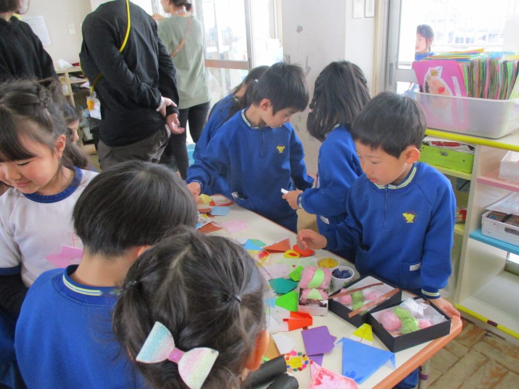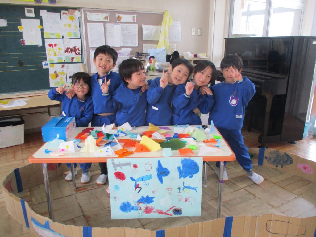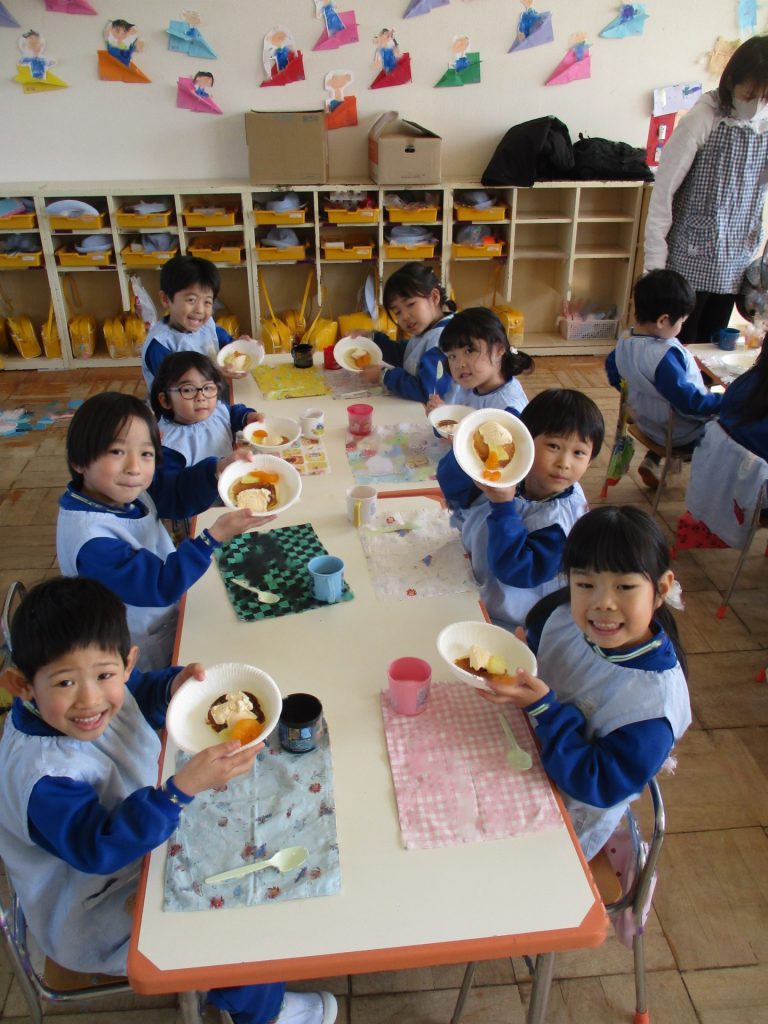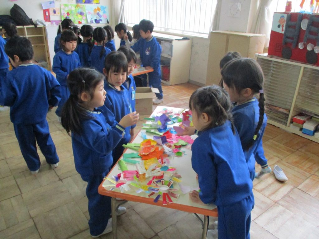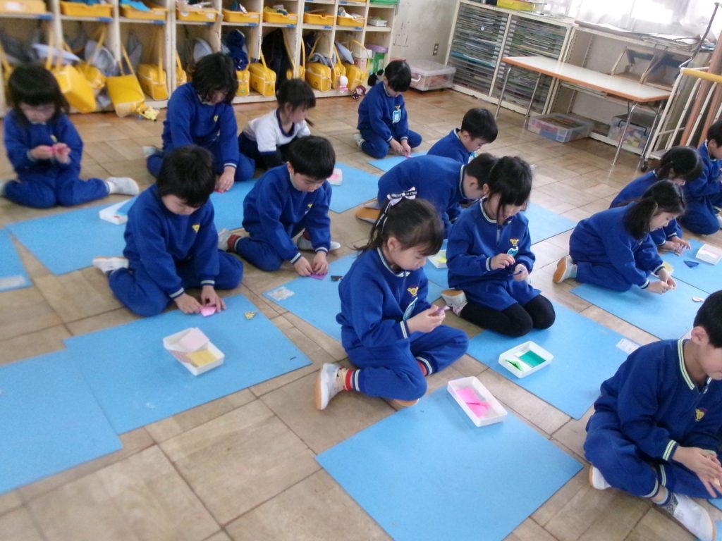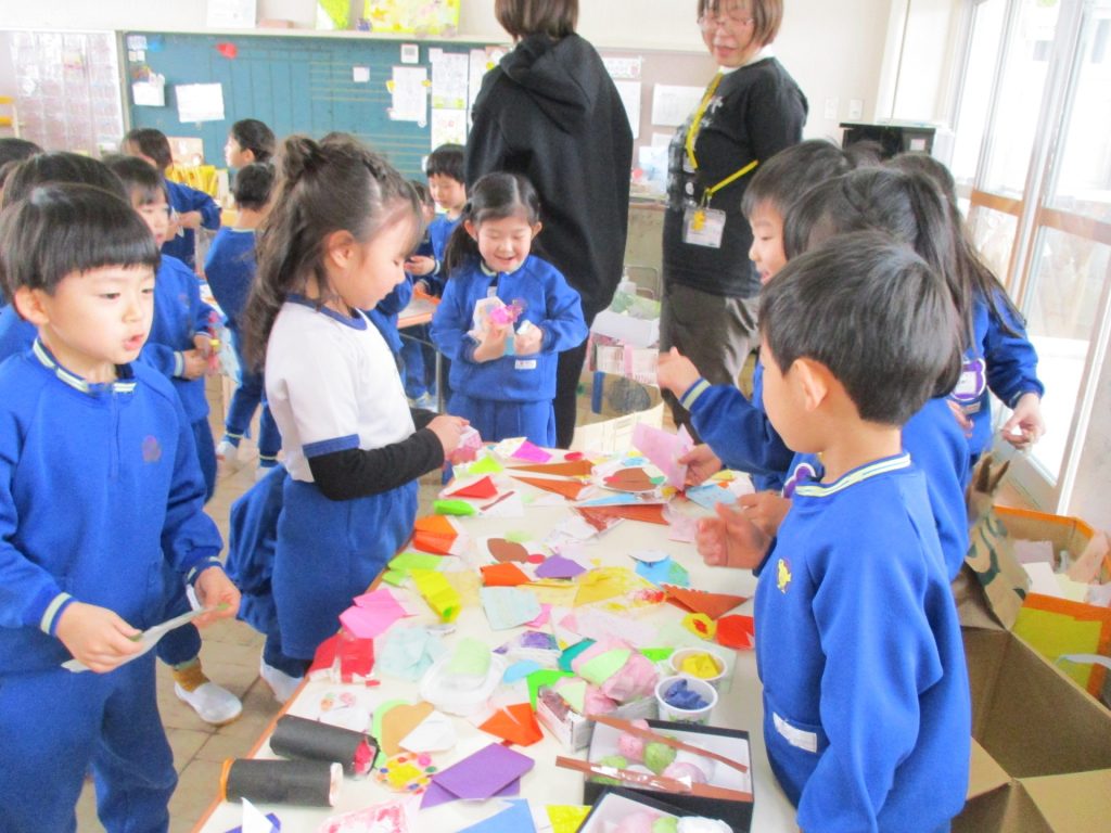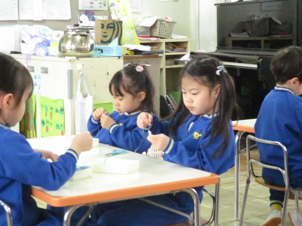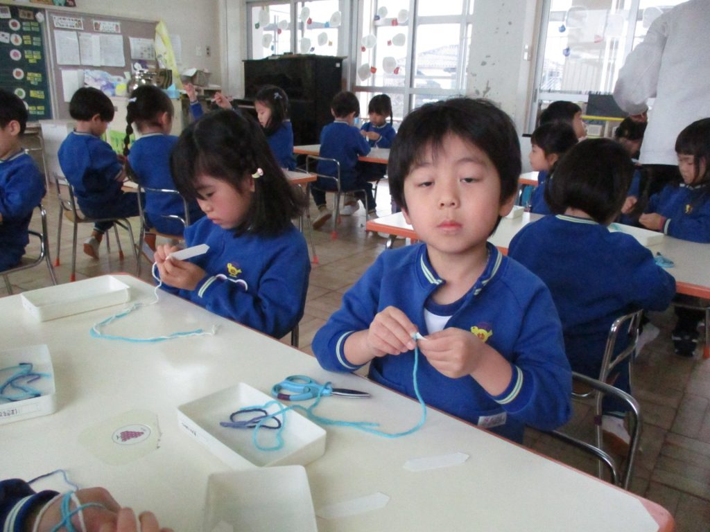 先日の節分に向けて、年中組は升を作りました。大きな紙に節分に関する絵を描き、それを折りました。日ごろの遊びで折り紙を楽しんでいるため、難しい折り方にも楽しんで取り組む姿が見られましたよ😊