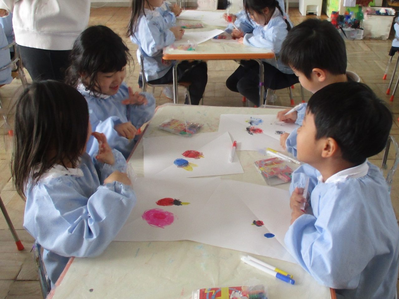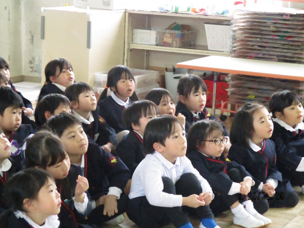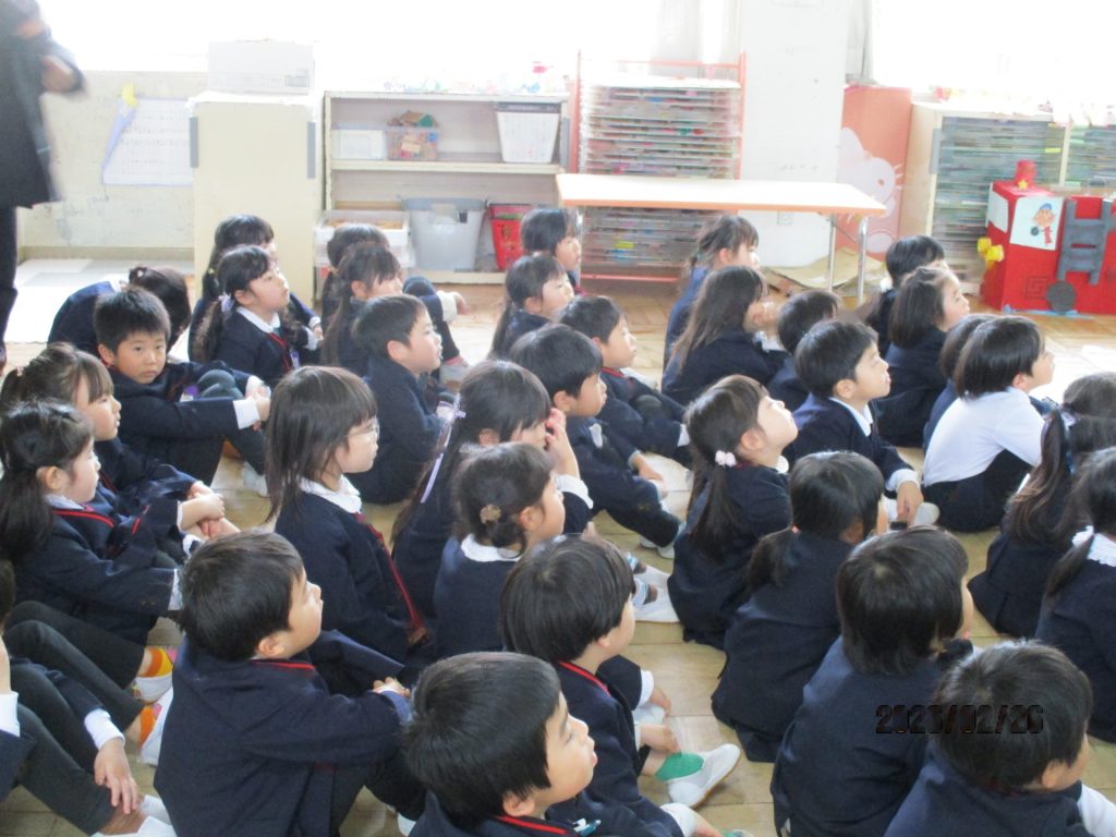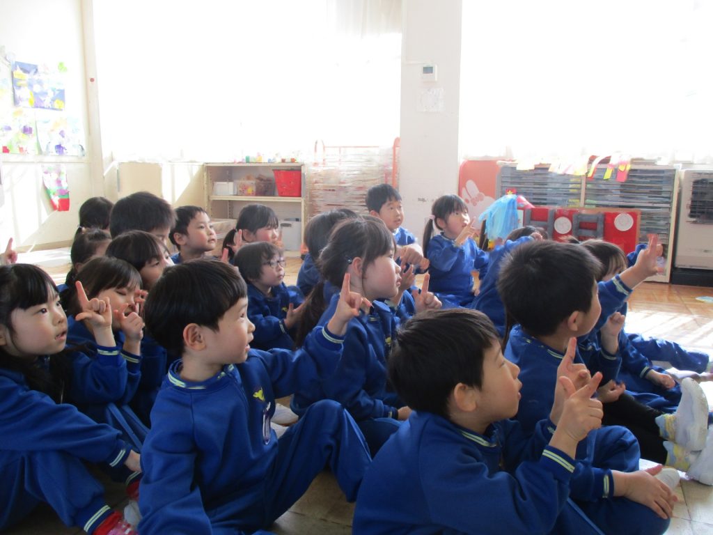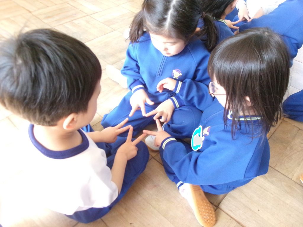 ABCの歌を歌った後、手や身体でアルファベットを作りました。また、アルファベット表を見て、先生が隠したものをすぐに当てていてびっくり!一年間を通して楽しく身についていると感じました⭐