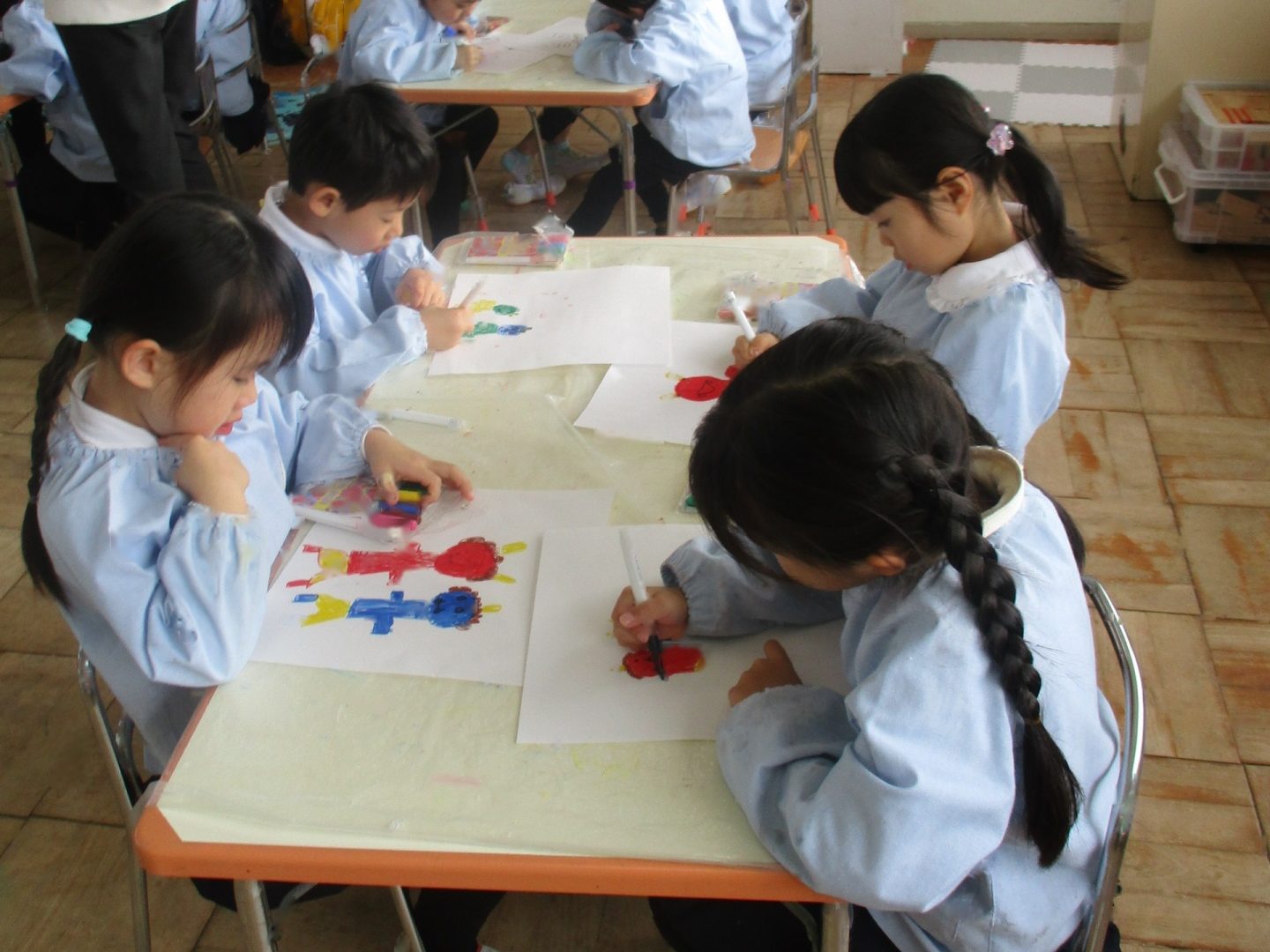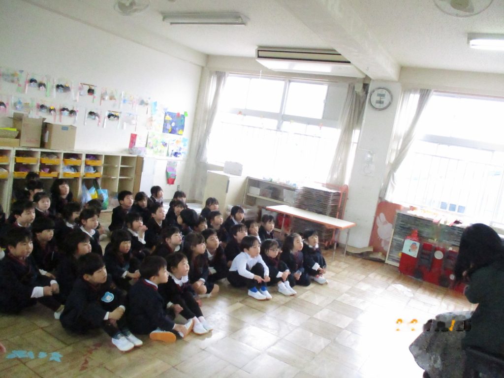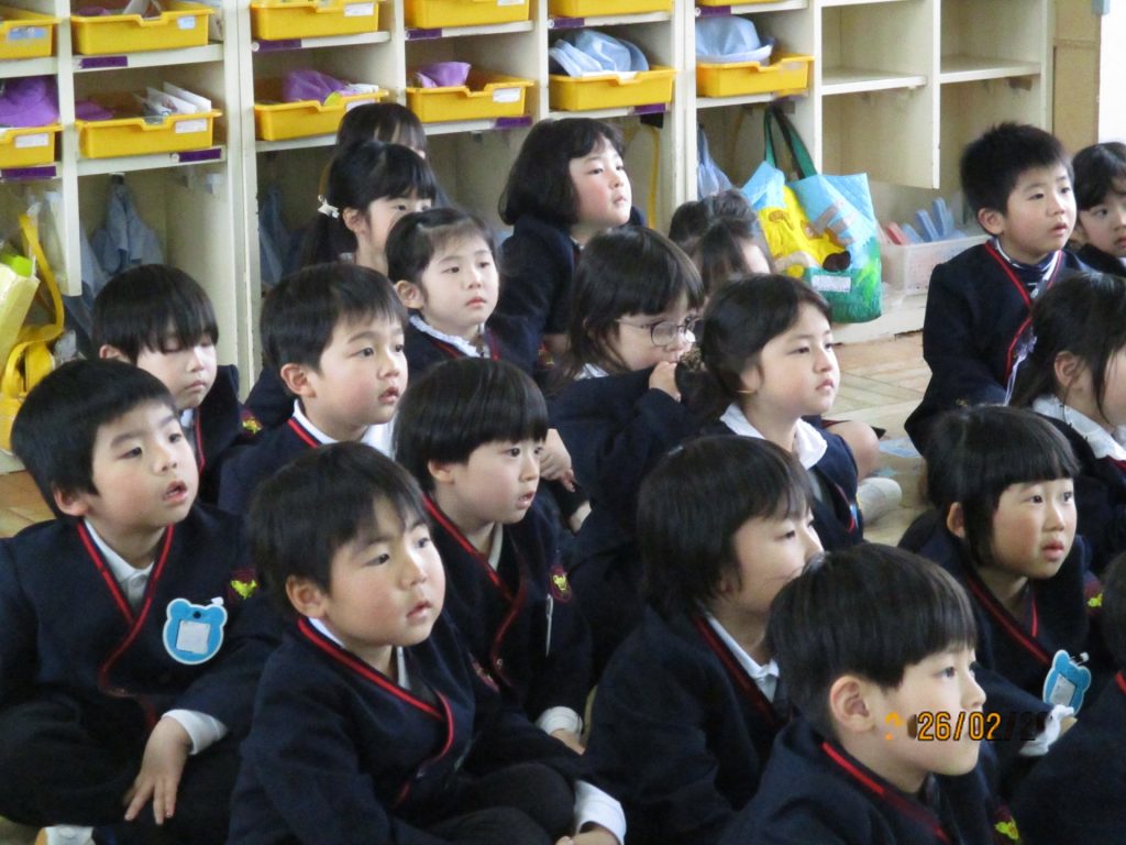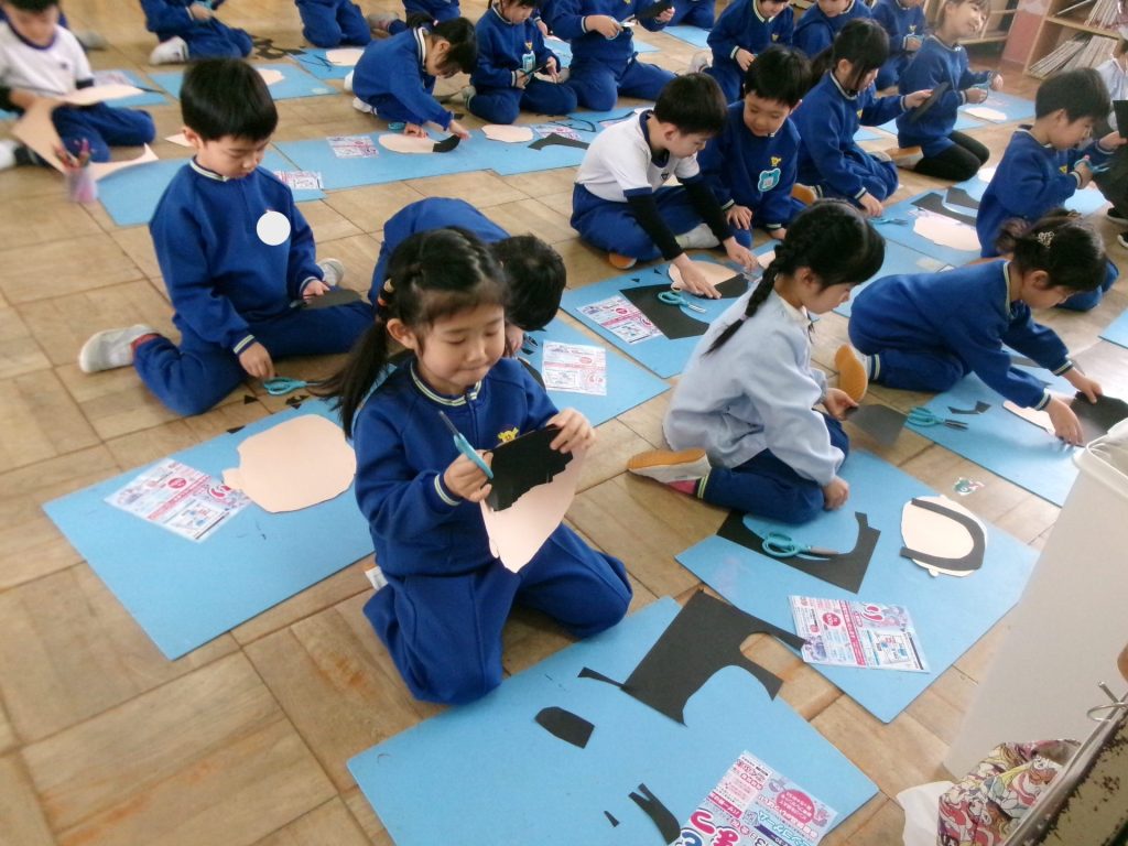 ABCの歌を歌った後、手や身体でアルファベットを作りました。また、アルファベット表を見て、先生が隠したものをすぐに当てていてびっくり!一年間を通して楽しく身についていると感じました⭐