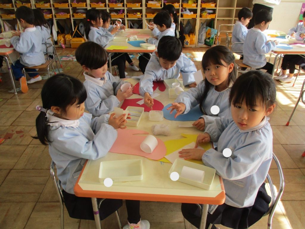 先日持ち帰った作品袋の制作の様子です。年中組では、自分の顔を初めて全部画用紙で作ってみました。一つ一つパーツを確認しながら作っていた子ども達。完成すると嬉しそうに見せてくれました!顔の周りには、折り紙でハートを折りました♡