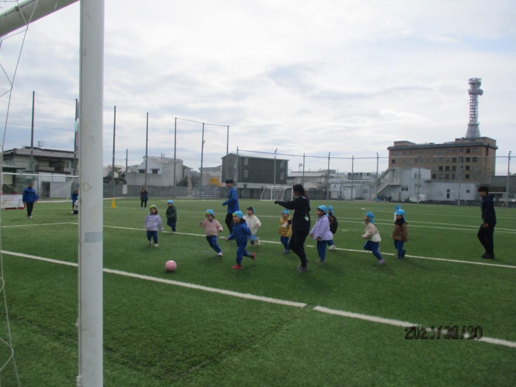 なかよしデーがありました。今回は城北高校に出掛けて広いグラウンドで思いきり体を動かしました。まずは準備運動!たくさん走って体操をしたり、ボールに触れたりしました。