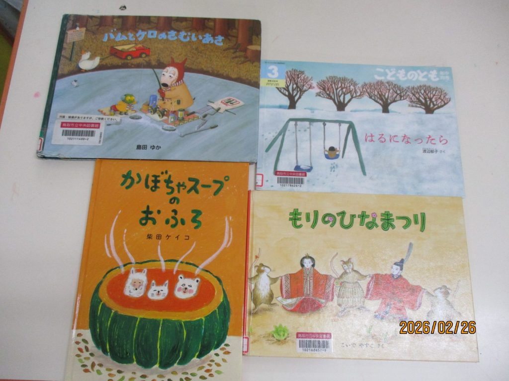 先日、絵本の読み聞かせがありました。まだまだ雪が降りそうな日が続いている今にぴったりの本を3冊読んでいただきました。