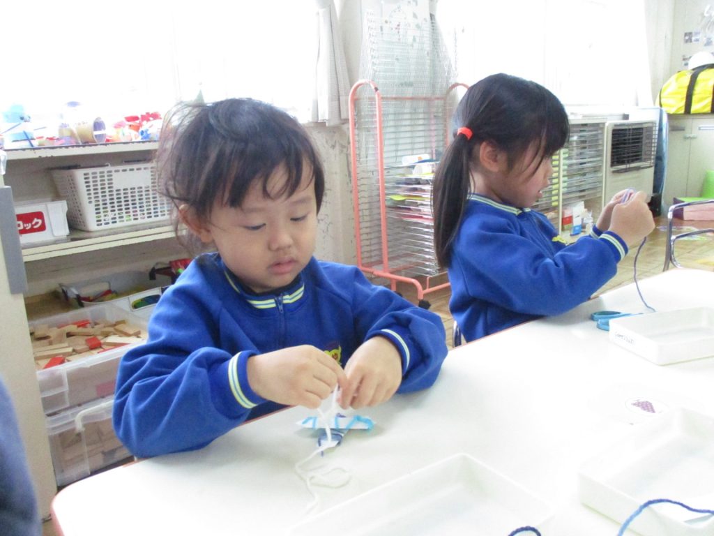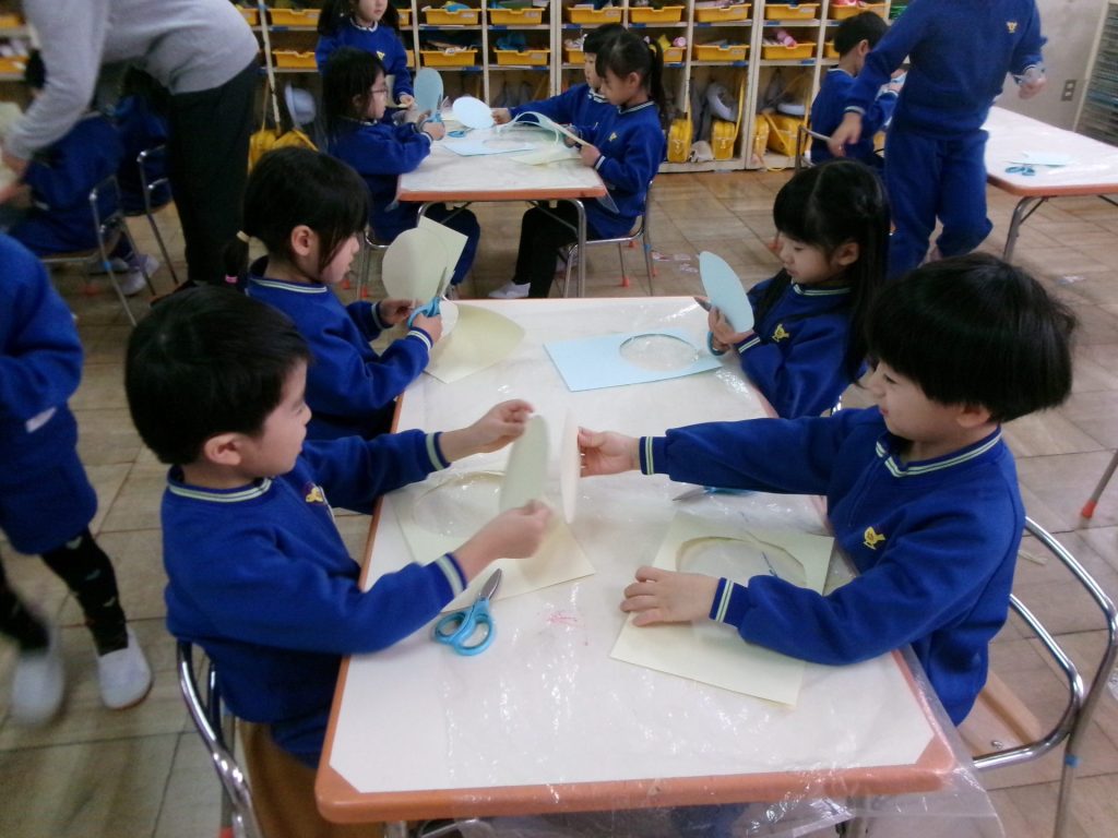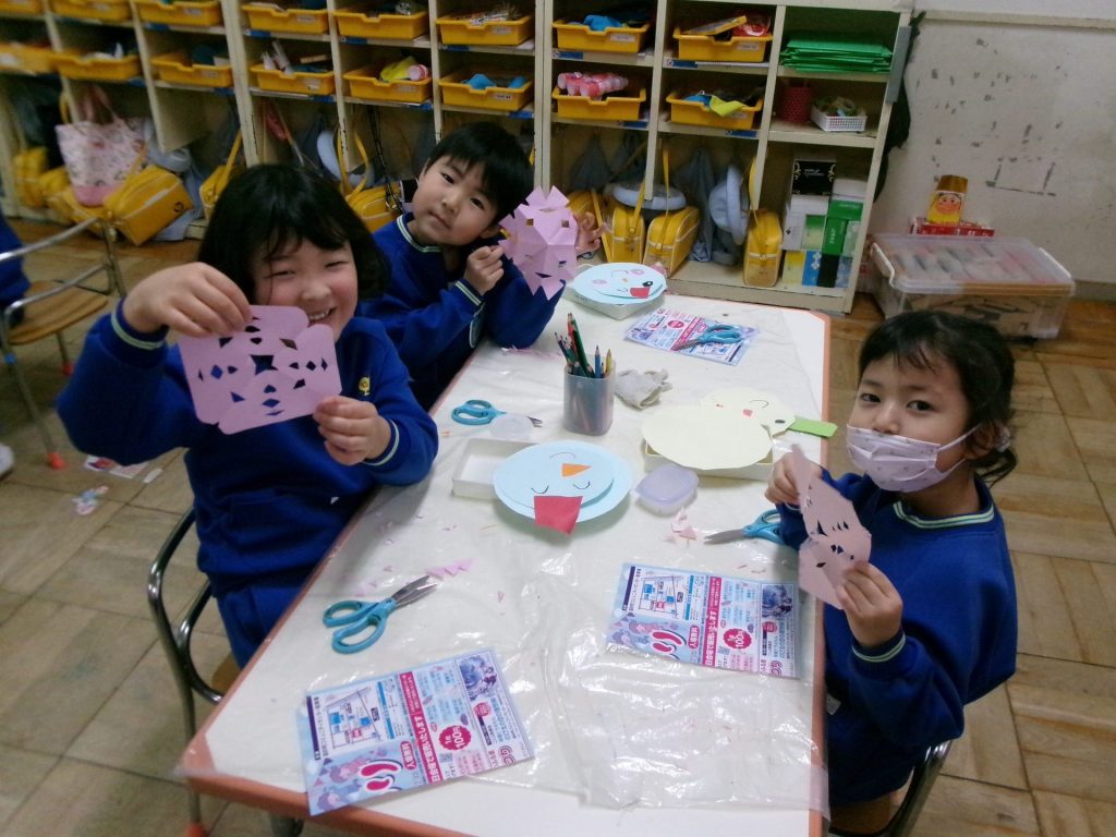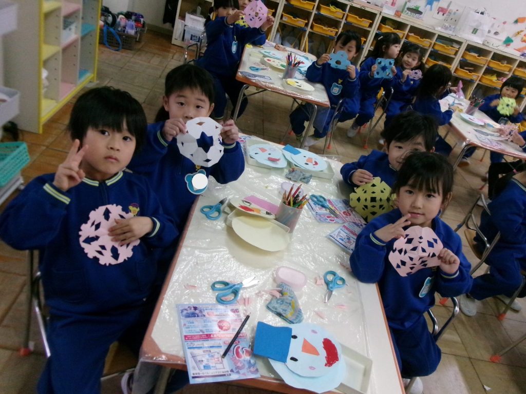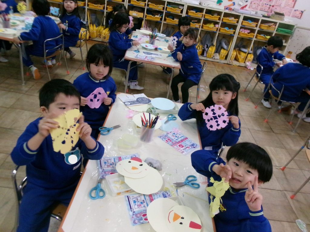 画用紙で丸を切り、人参の鼻・バケツは自分で考えながら切りました!そして、今回は雪の結晶に挑戦!はさみで少しずつ切っていくと形が変わり、そして友達とも形が違っていることに気づき、見せ合いこして楽しんでいました☆