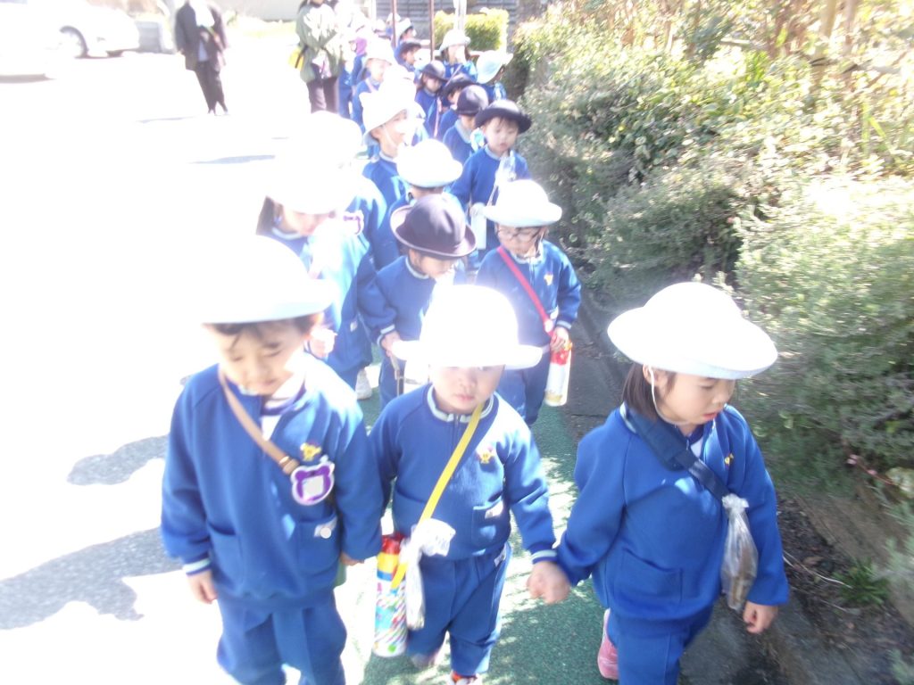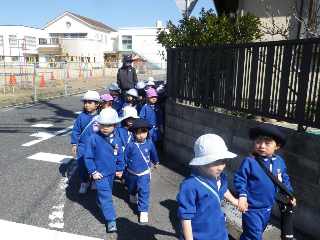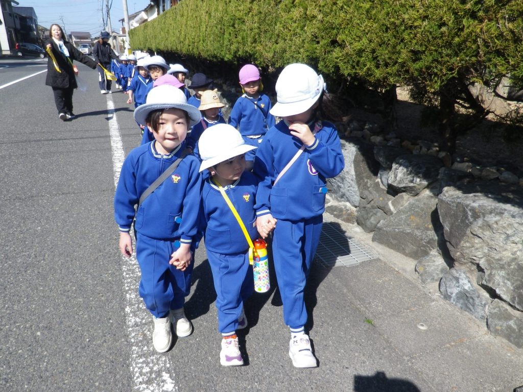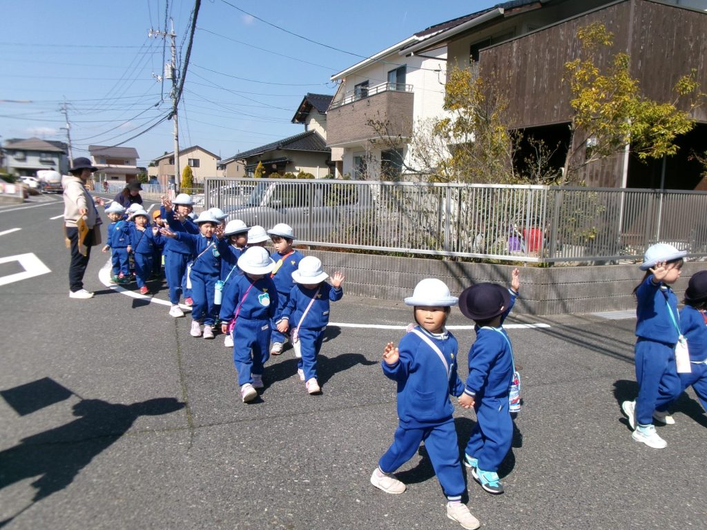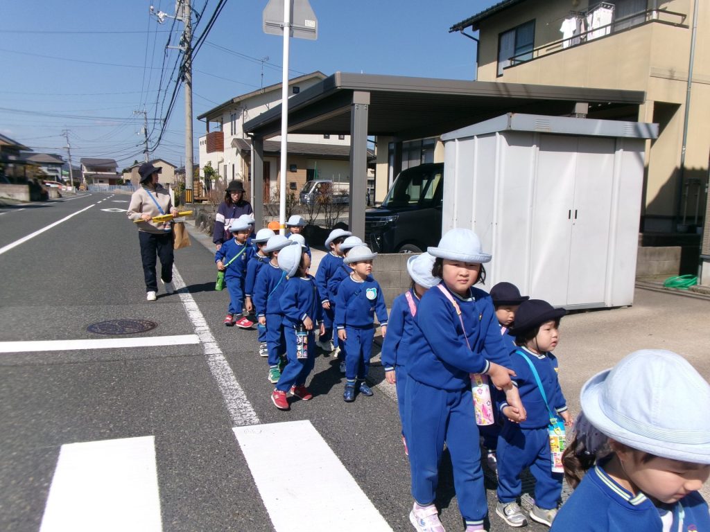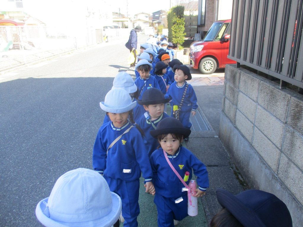 年中さんと2歳さんで近くの公園まで歩いて行きました。お兄さん、お姉さんが優しく手を繋いでくれたり、声をかけてくれたりして、嬉しそうに歩く2歳さんでした♪