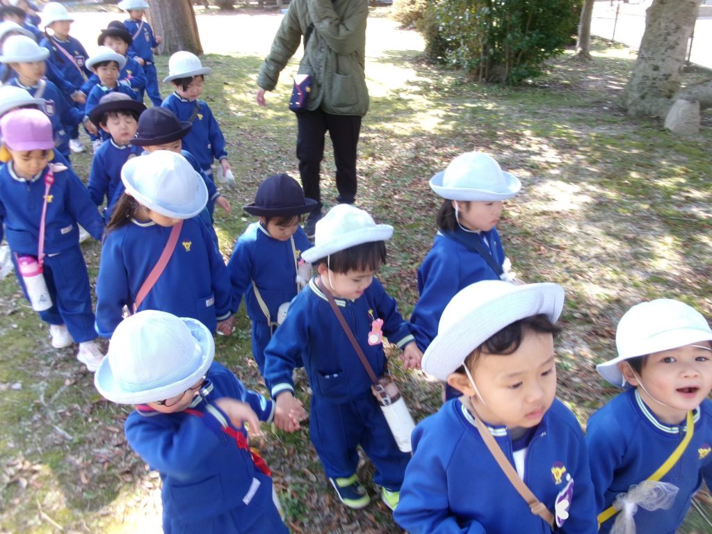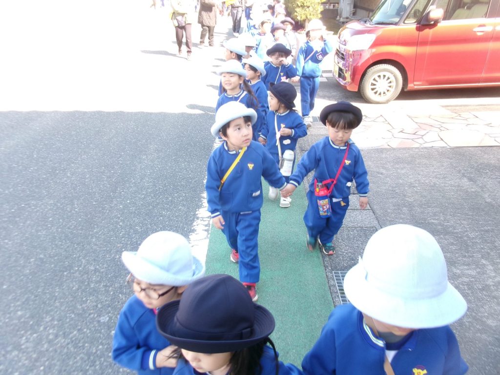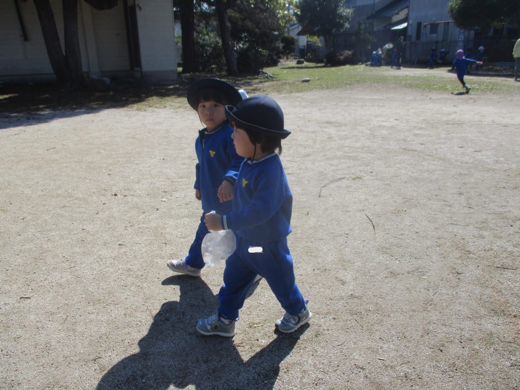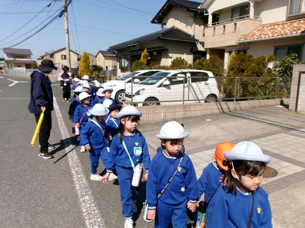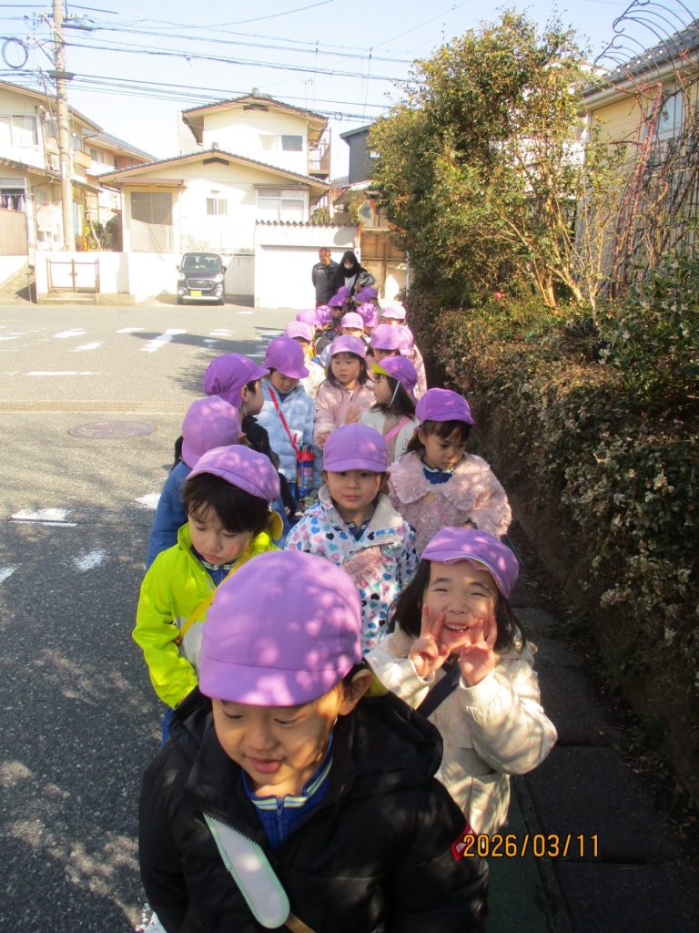 年中さんと2歳さんで近くの公園まで歩いて行きました。お兄さん、お姉さんが優しく手を繋いでくれたり、声をかけてくれたりして、嬉しそうに歩く2歳さんでした♪