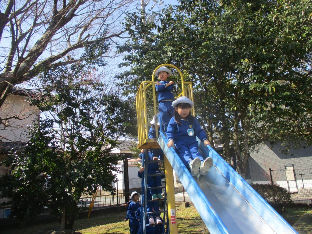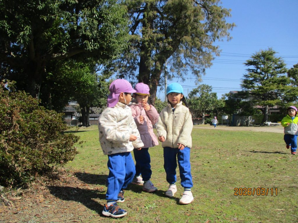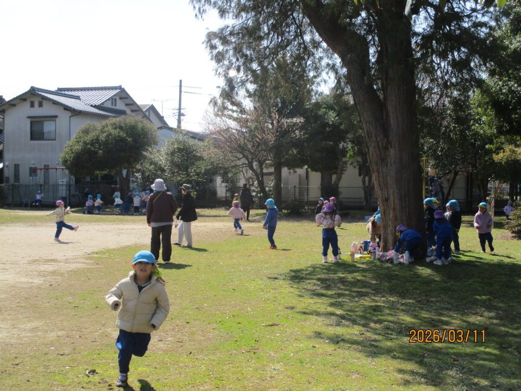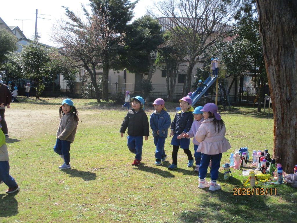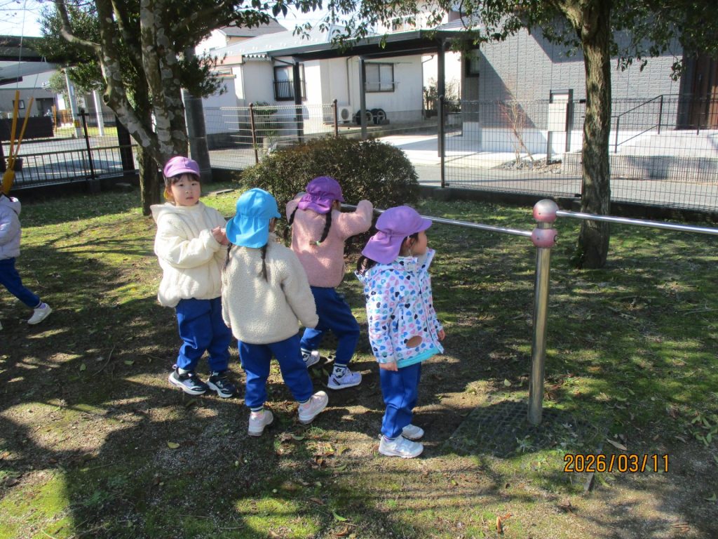 公園に到着!好きな遊具を見つけて遊んだり、氷鬼や春見つけを楽しんだりする子ども達でした。なんとつくしも発見しました!春を感じながらたっぷりと楽しみました♪
