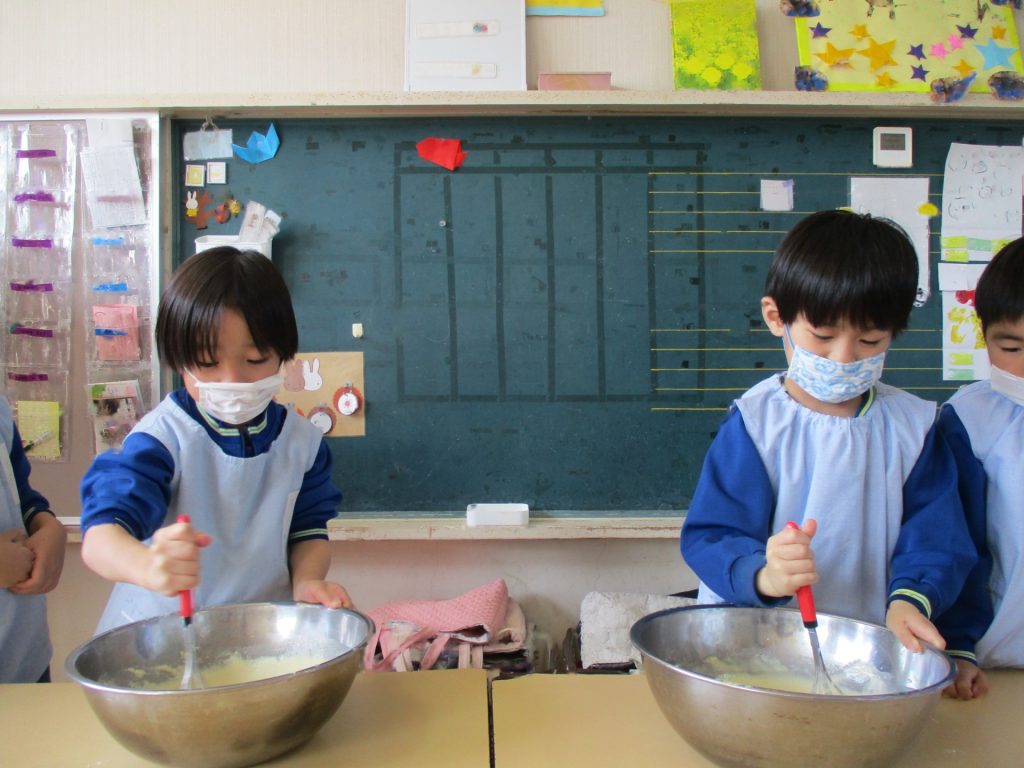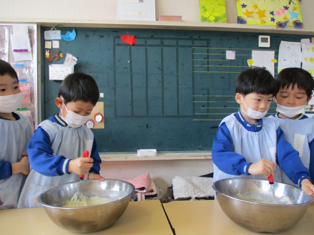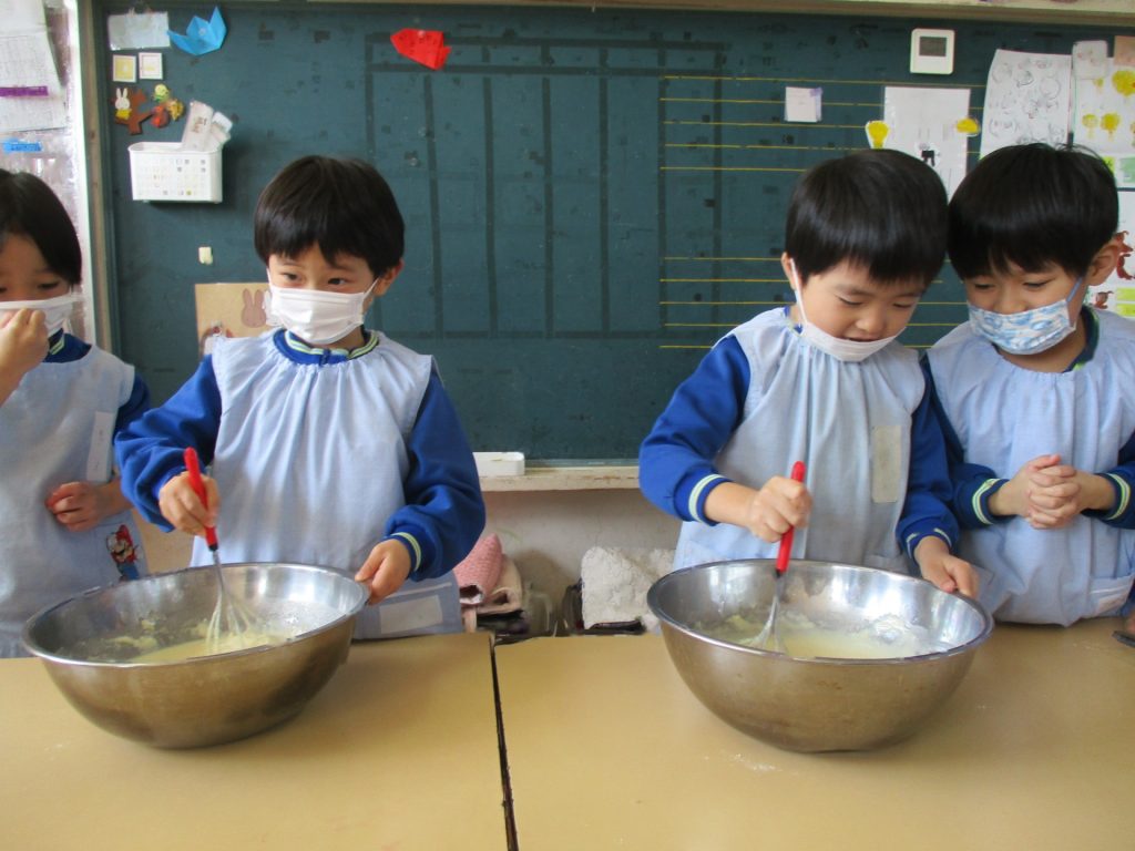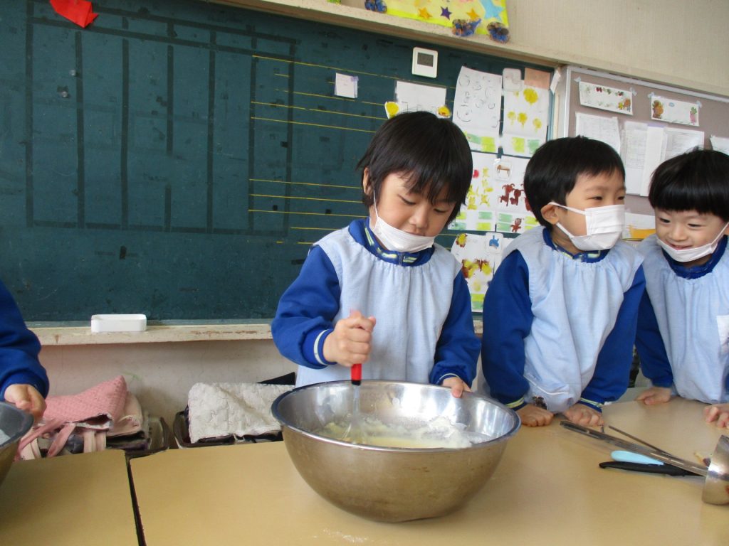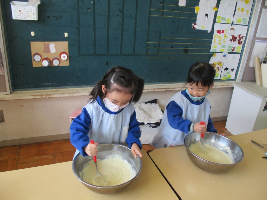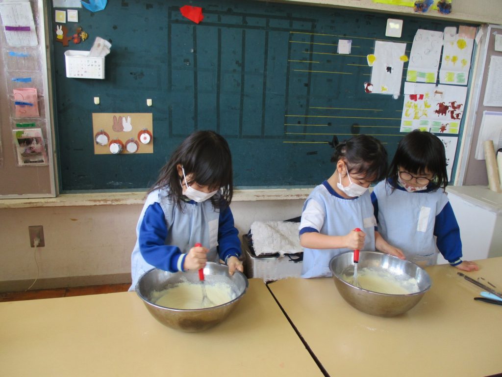 年中組最後のクッキングをしました!「最後のクッキング、何を食べたい?」と聞くと「ピザ!ぎょうざ!ケーキ!くだもの!」といろんな案が出てきました!今日はその中からホットケーキを選び、みんなで作りました!