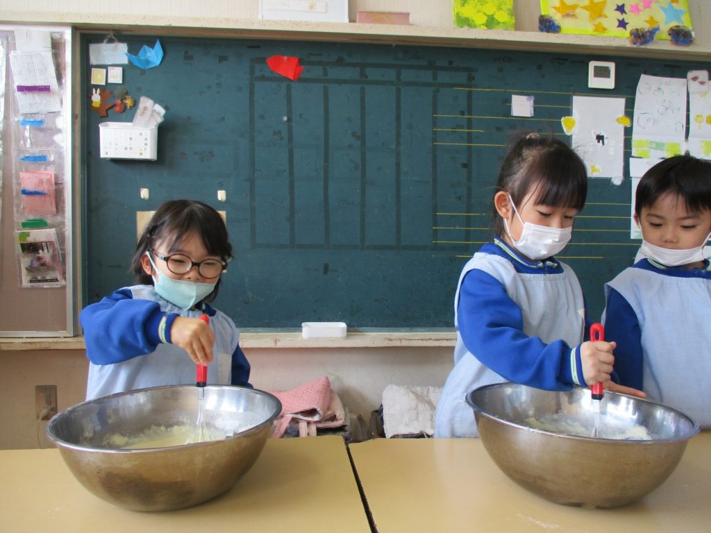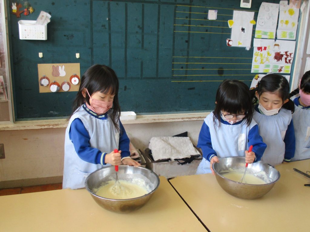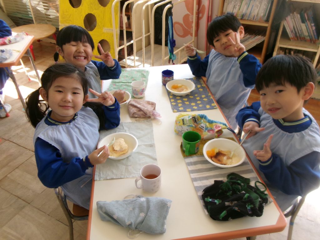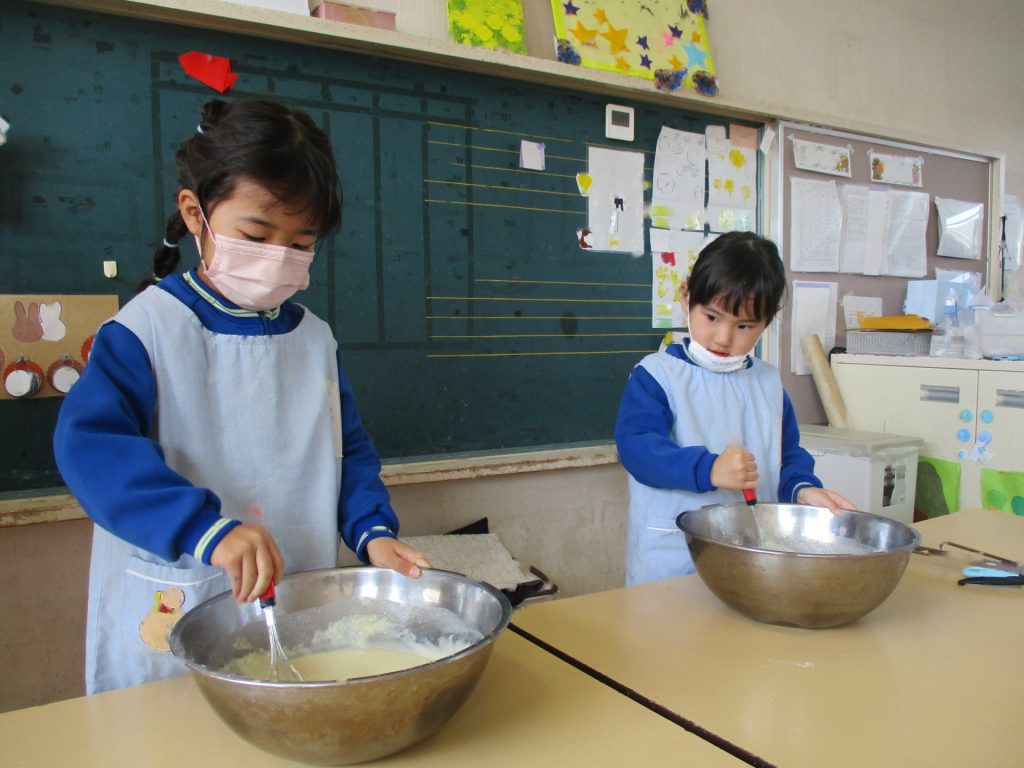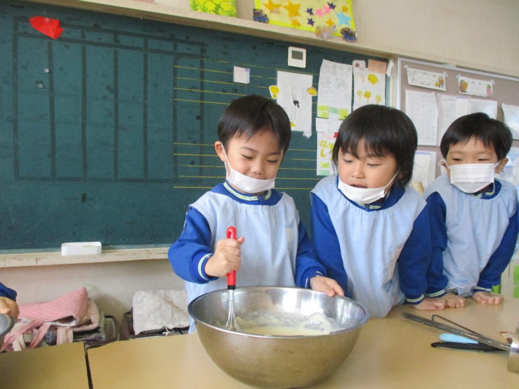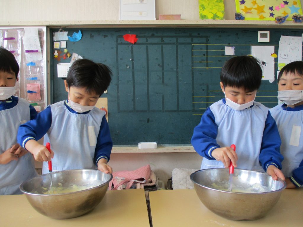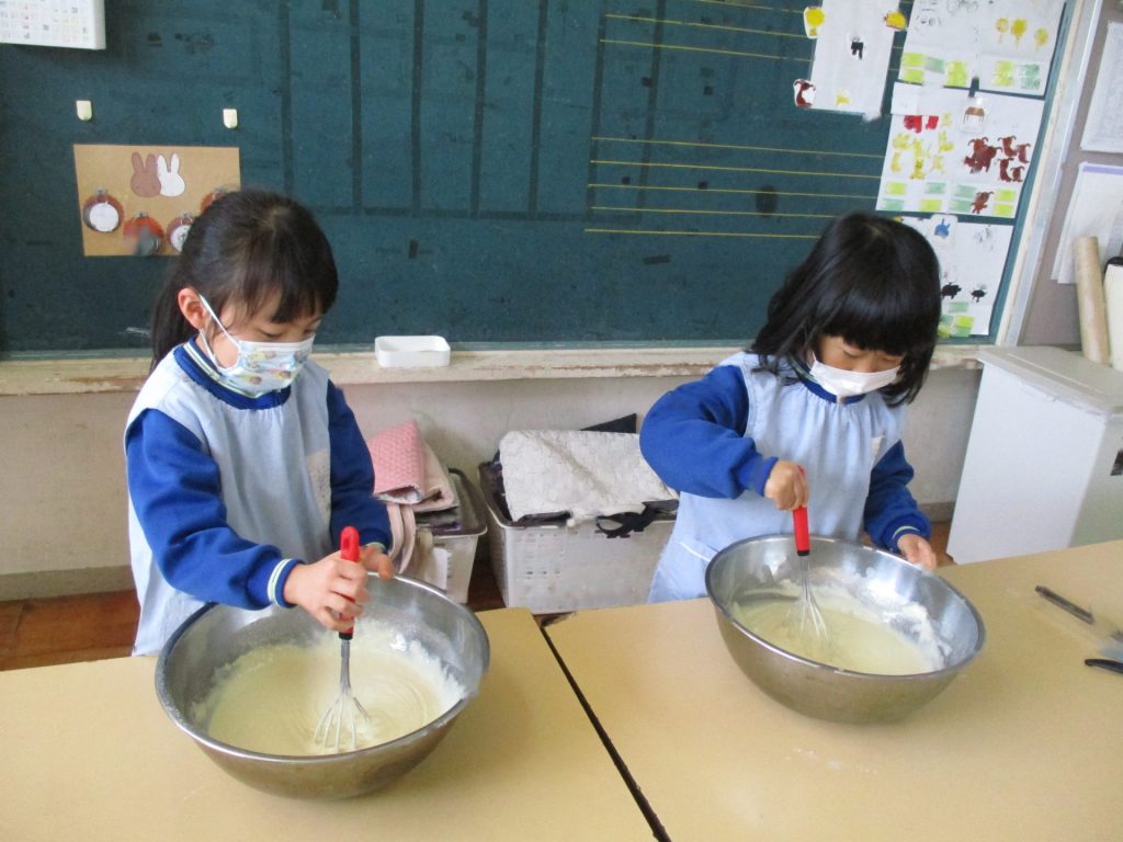 年中組最後のクッキングをしました!「最後のクッキング、何を食べたい?」と聞くと「ピザ!ぎょうざ!ケーキ!くだもの!」といろんな案が出てきました!今日はその中からホットケーキを選び、みんなで作りました!