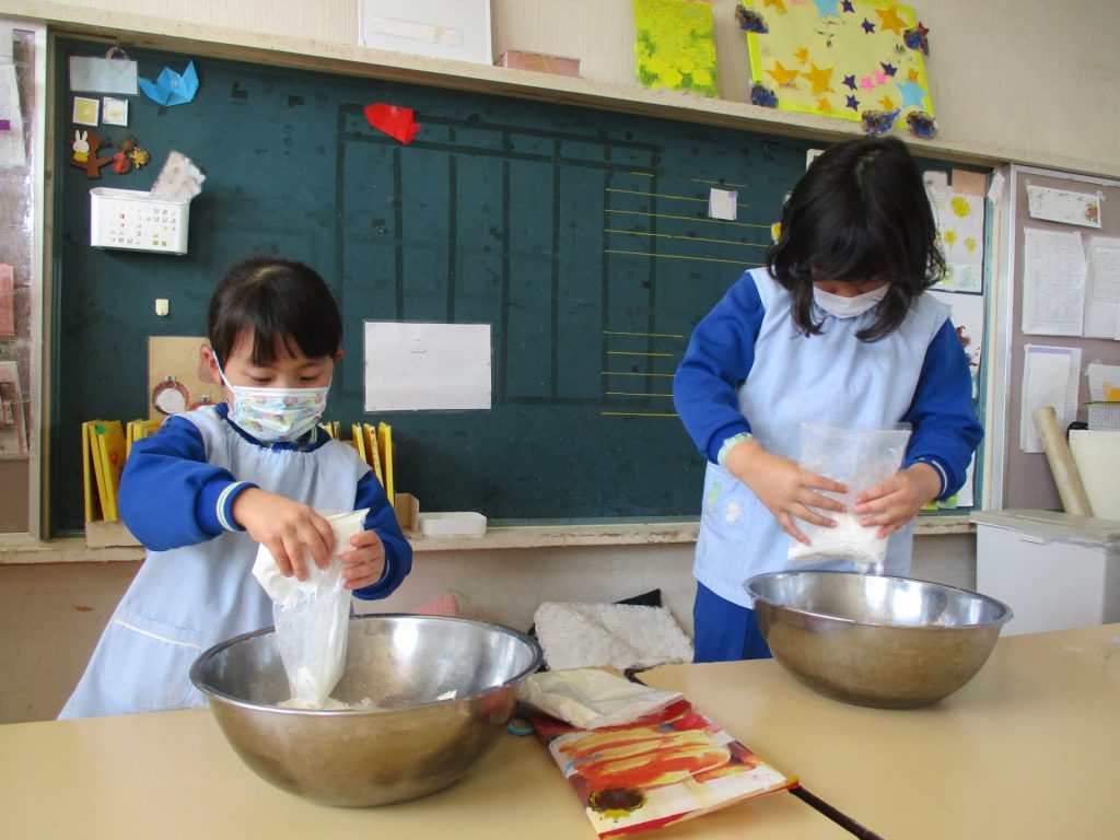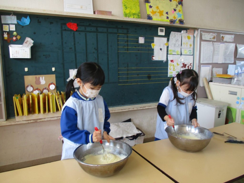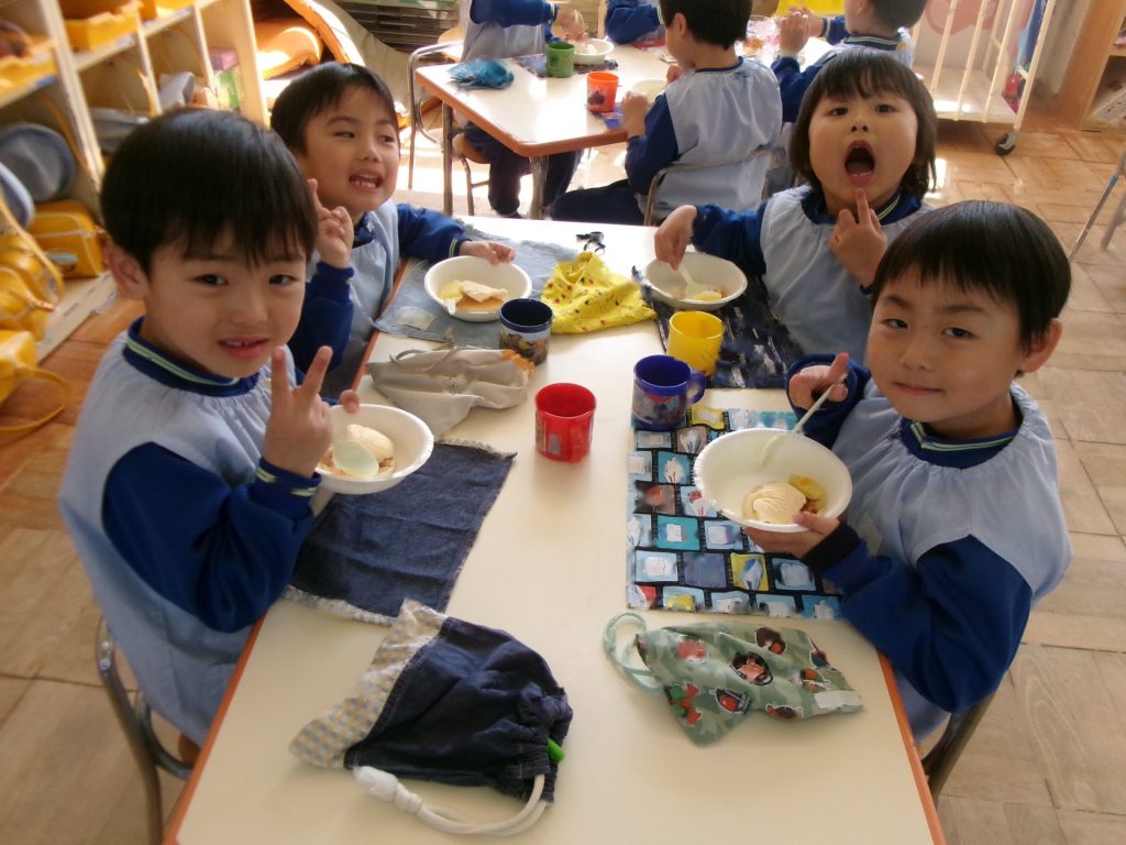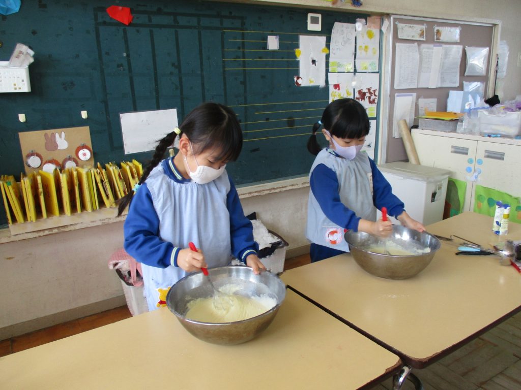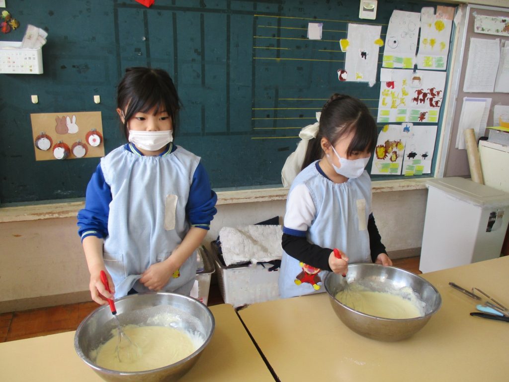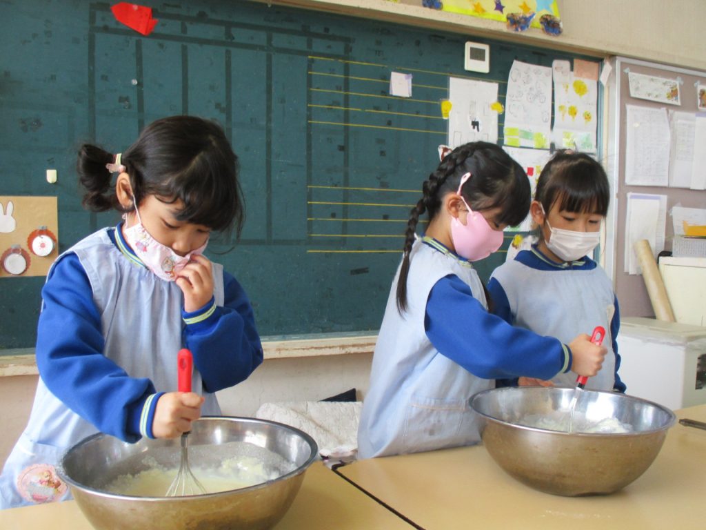 年中組最後のクッキングをしました!「最後のクッキング、何を食べたい?」と聞くと「ピザ!ぎょうざ!ケーキ!くだもの!」といろんな案が出てきました!今日はその中からホットケーキを選び、みんなで作りました!