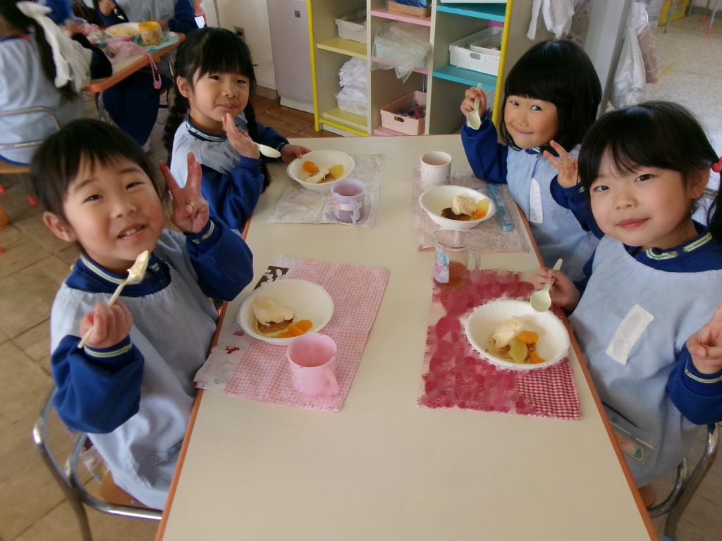 焼きあがったホットケーキにアイスと缶詰をトッピングしました!「美味しい!幸せ!」と言いながら友達と一緒に楽しく食べていました!美味しかったね♪