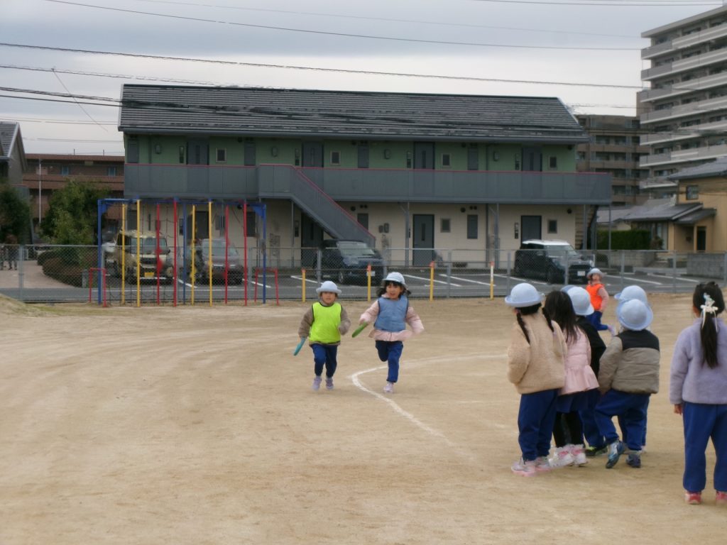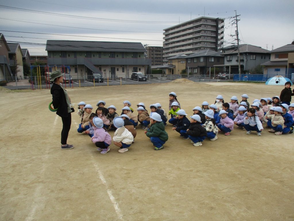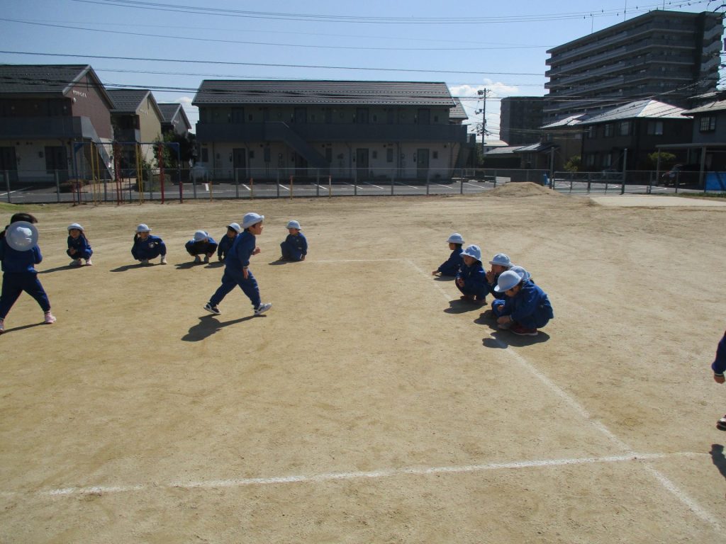園庭でリレーとドッヂボールをしました!初めにルールを確認しました。今回はクラス対抗です!子ども達の負けられない戦いが始まります!