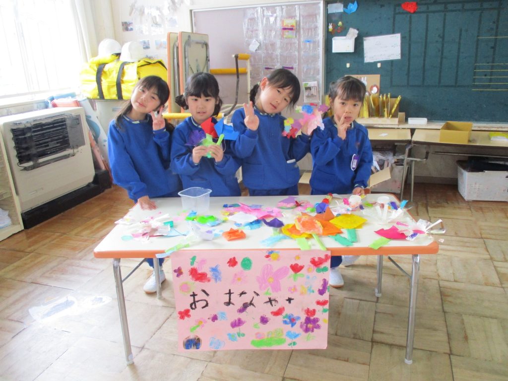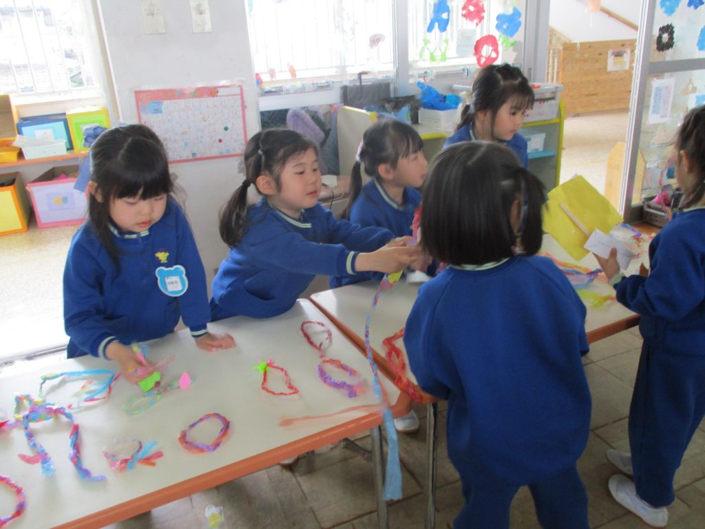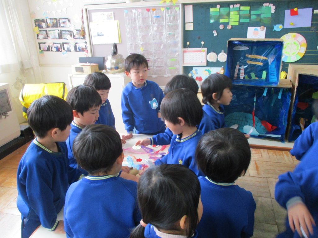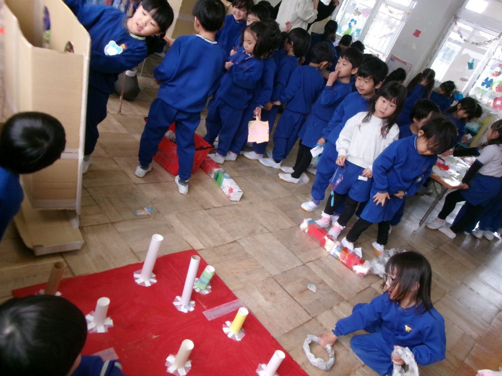 年中組でおみせやさんごっこをしました!すみれ組では「のりものやさん・れすとらん・さかなやさん・はなやさん・ふくやさん」ゆり組では「すいぞくかん・あくせさりーやさん・ゆきのけっしょうやさん・げーむこーなー」がオープンしました!一年間いろいろな制作で身についた力を発揮して友達と一緒に作ってきました!お客さんは来てくれるかな?「いらっしゃいませ!!」